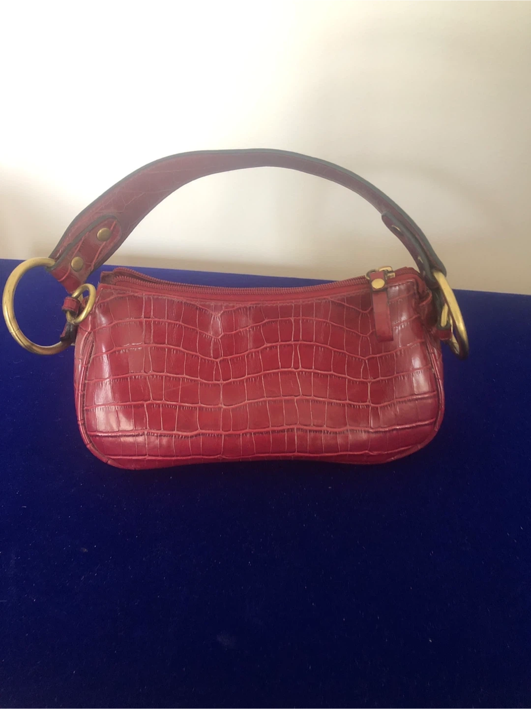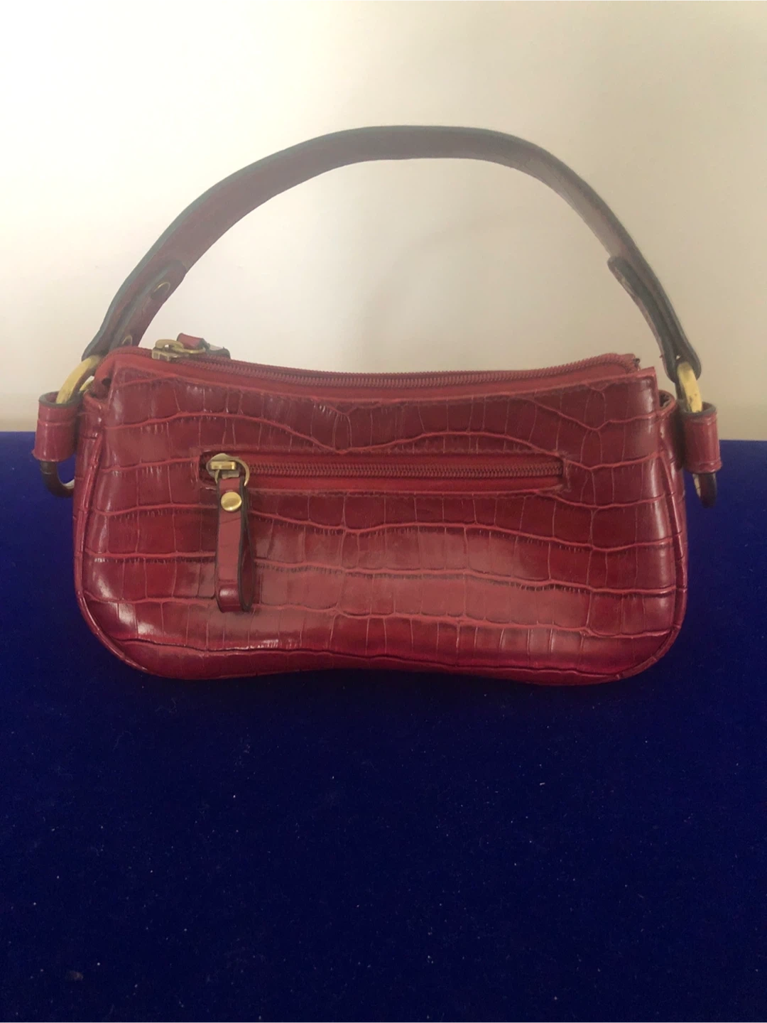 This stylish red shoulder bag features a croc-embossed texture and gold-tone hardware. It has a main zippered compartment and a zippered pocket on the back. It's a great everyday bag!