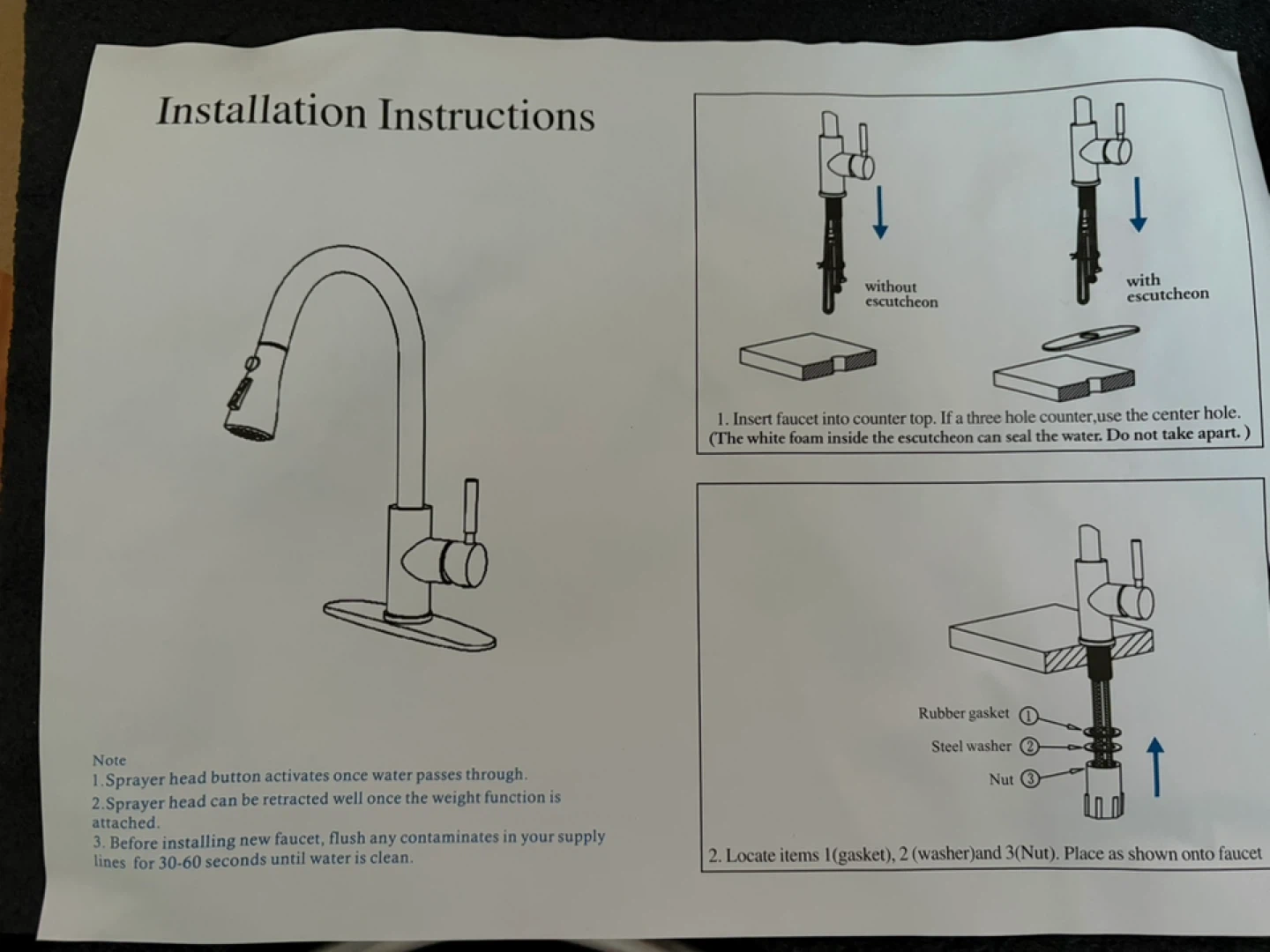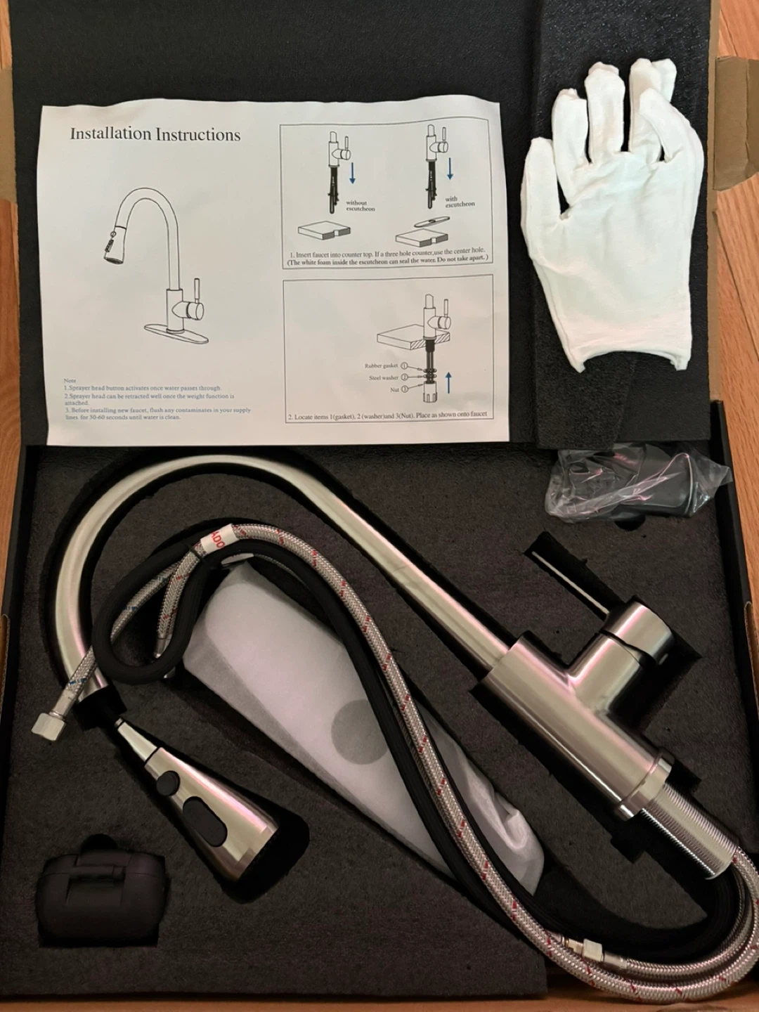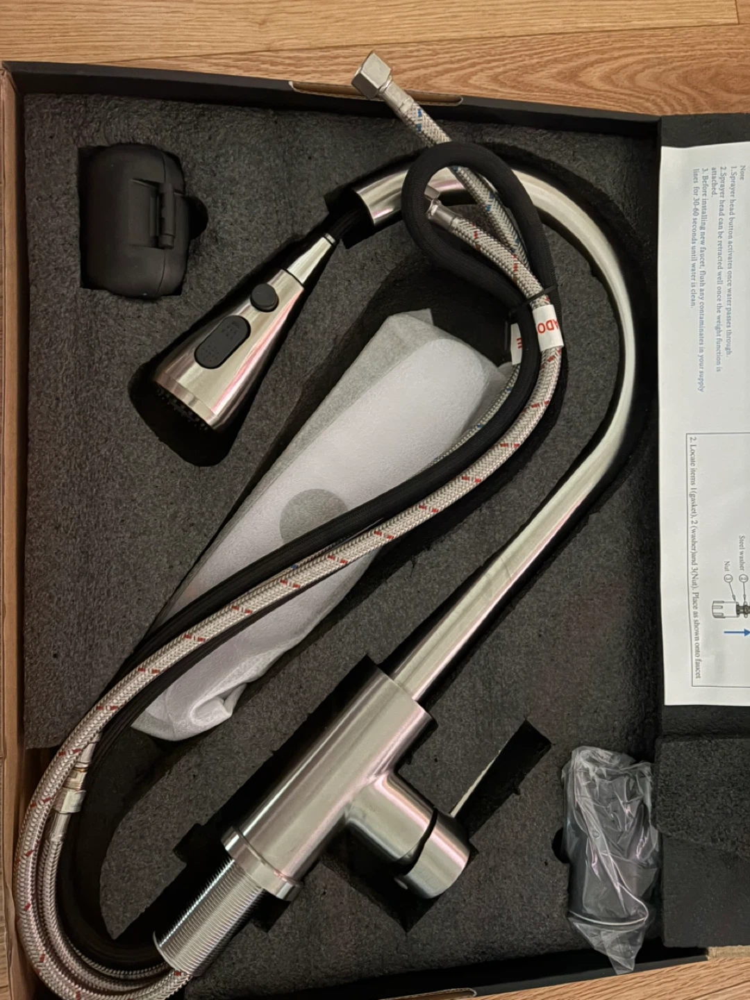 This HUAAKE faucet features a pull-down sprayer. It's made of brushed nickel. The sprayer head can be retracted once the weight function is attached. Installation instructions are included.