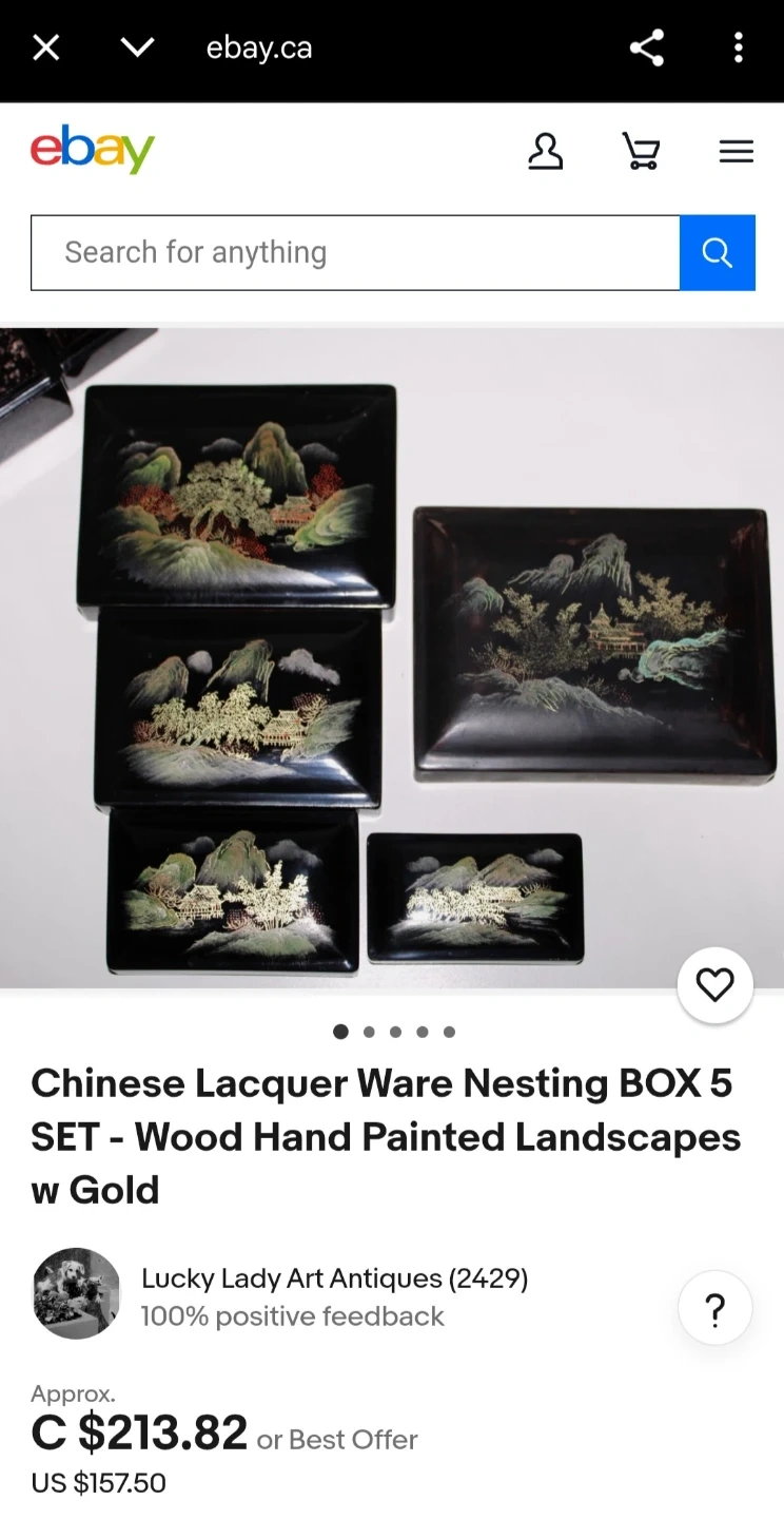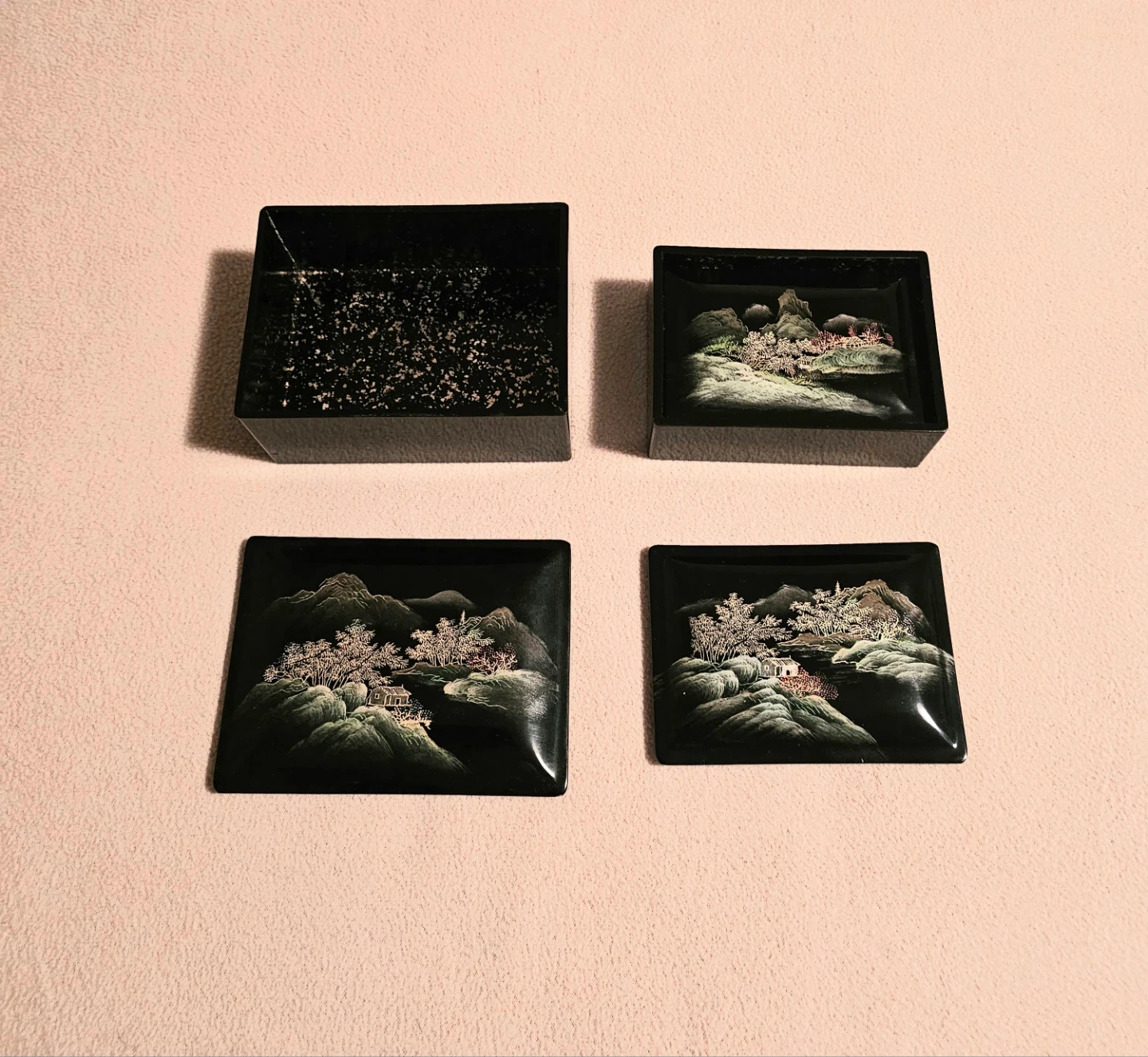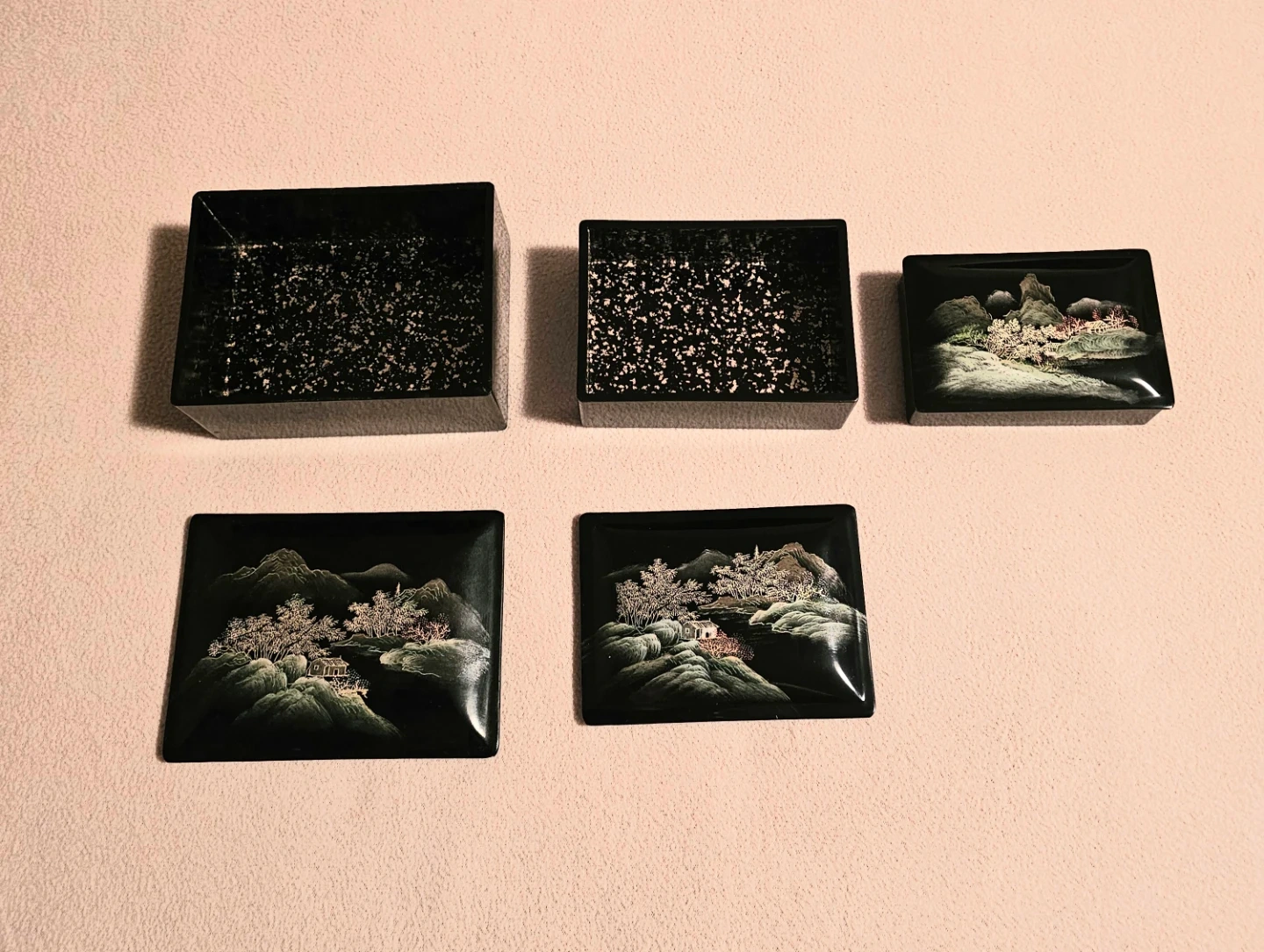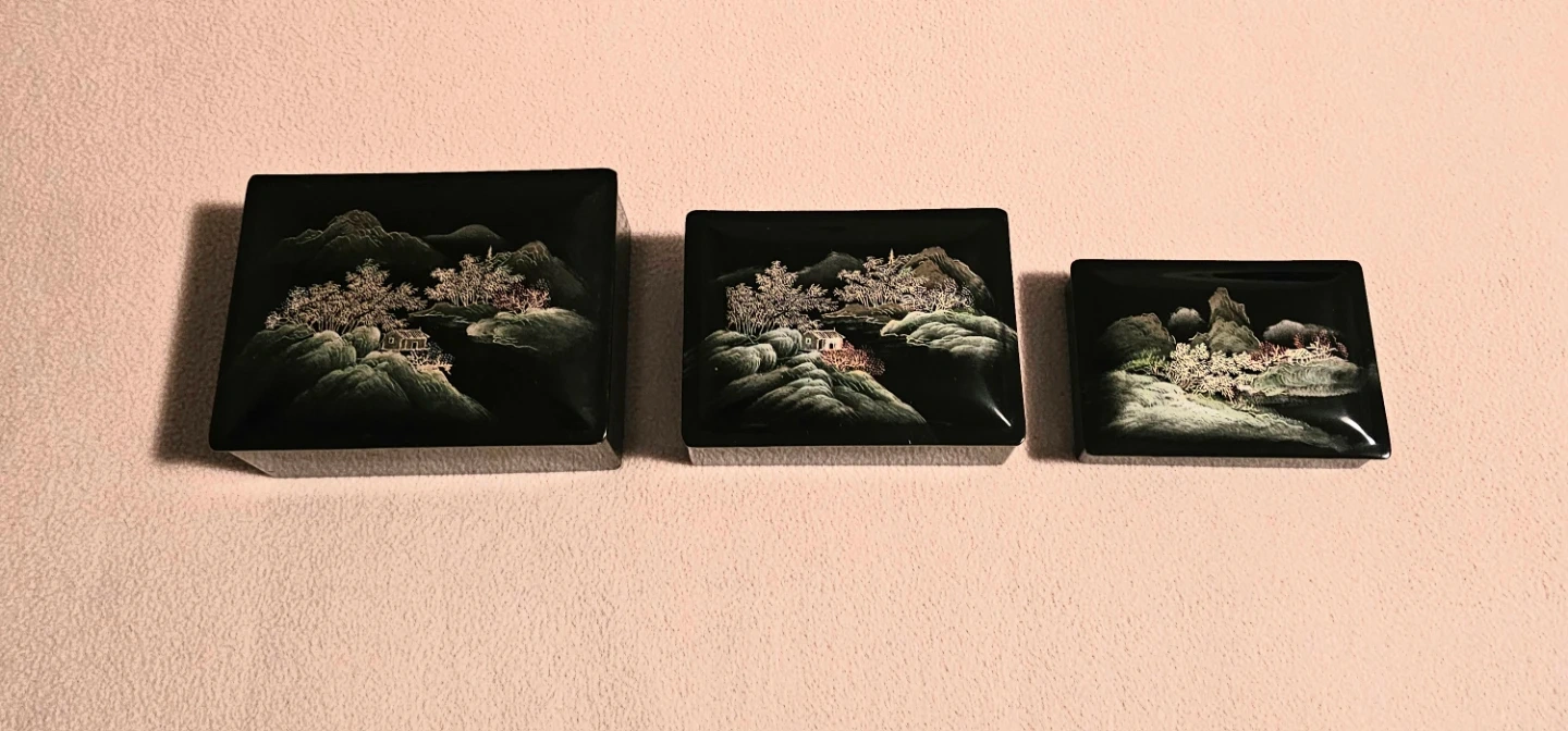 This beautiful hand-painted vintage set includes 3 black lacquer boxes, features a decorative landscape design with trees and mountains. Nesting boxes have speckled glitter interior. They're perfect for organizing small items or as decorative accents, collectible pieces. They offer a touch of elegance to any space! $12