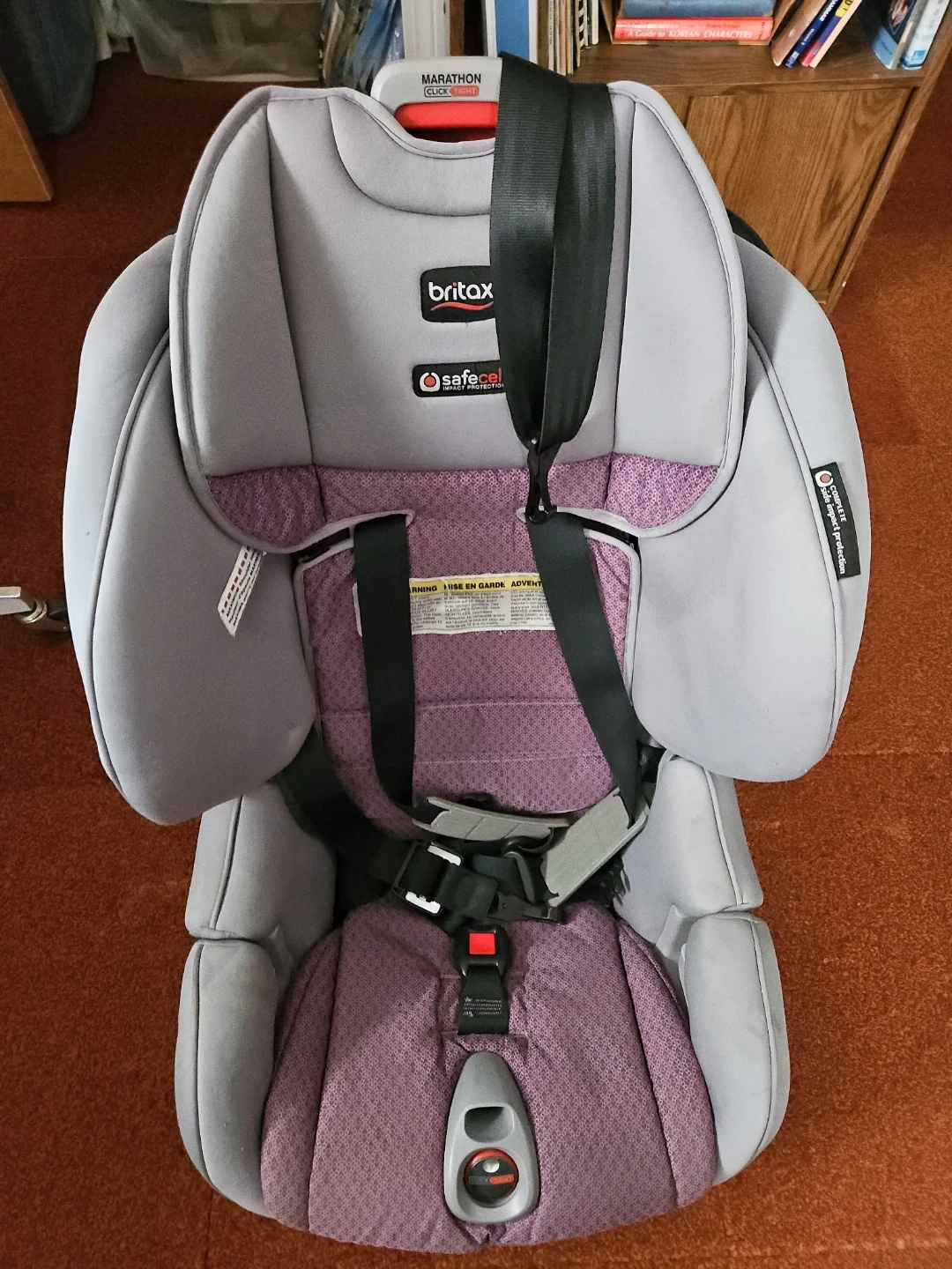 This Britax Marathon car seat is gray with purple accents. It features SafeCell Impact Protection and the ClickTight Installation System. It has adjustable straps and a padded headrest.