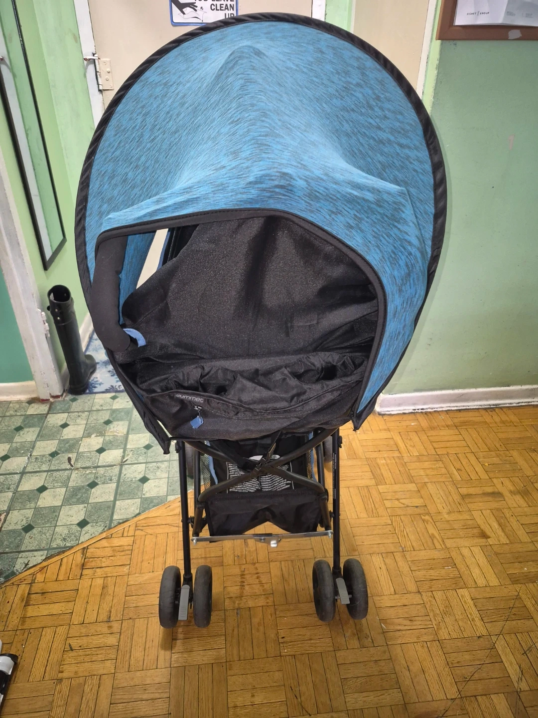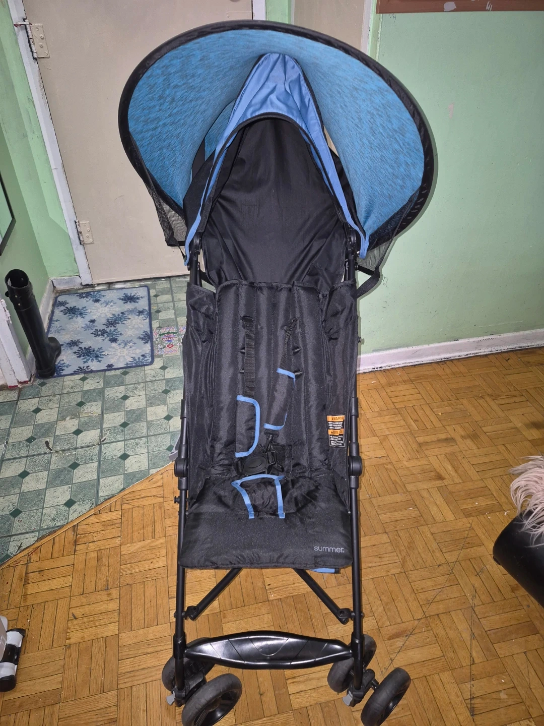 This is a Summer Infant lightweight stroller in black with blue accents. It's designed for easy portability. It features a canopy and a 5-point harness for safety.