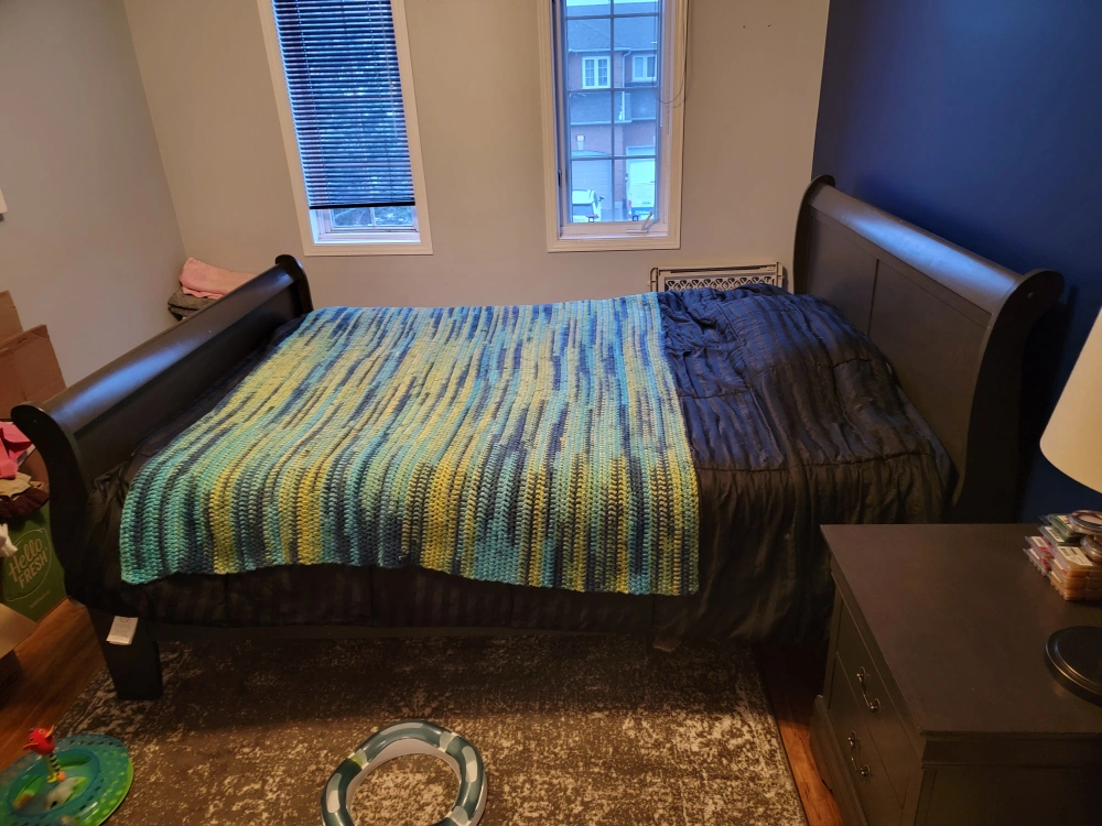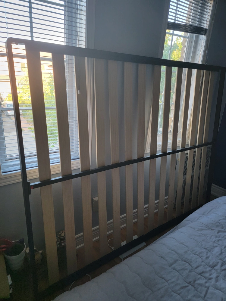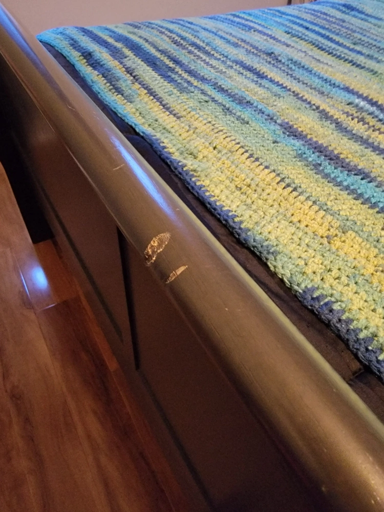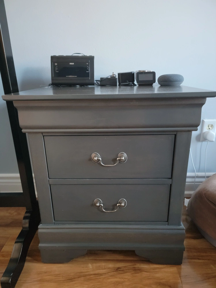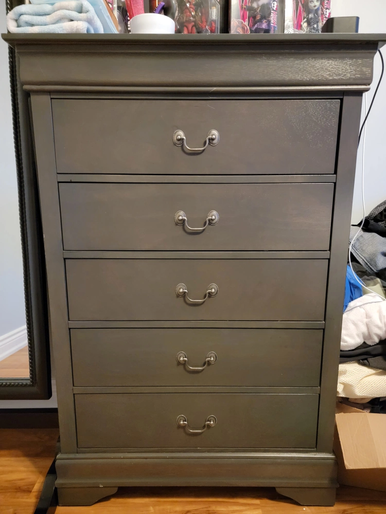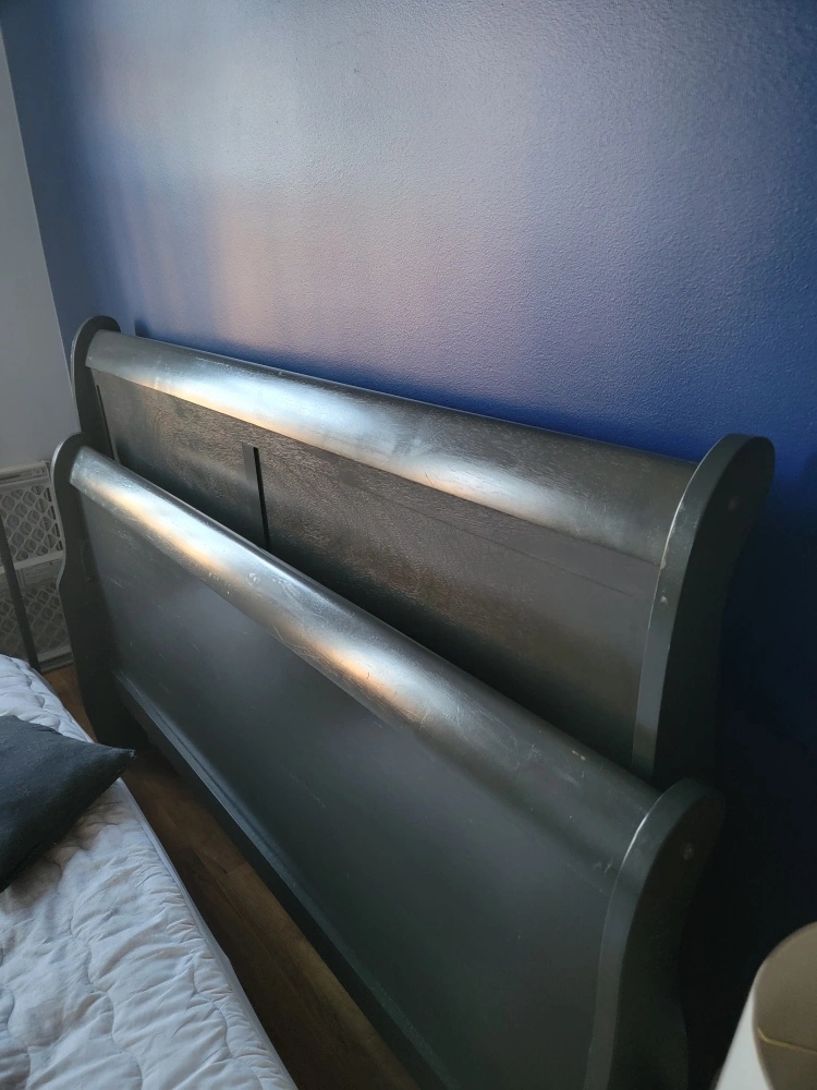 Gray bedroom set bought from the Brick in 2018. I believe it was called Lyla. It has been moved 3 times and has some marks to show for it (the bed frame). The queen bed frame (mattress not included) is missing the 3 small feet that went underneath the bed, down the middle, as extra support (they were thin and never actually helped. I used a couple blocks of wood instead, as that worked better). The bed is also quite high if you use a boxspring. The dresser and nightstand are in great condition and the whole set was in the guest bedroom, which was barely used. The bumps and scrapes from being moved so much are mostly on the bed frame.