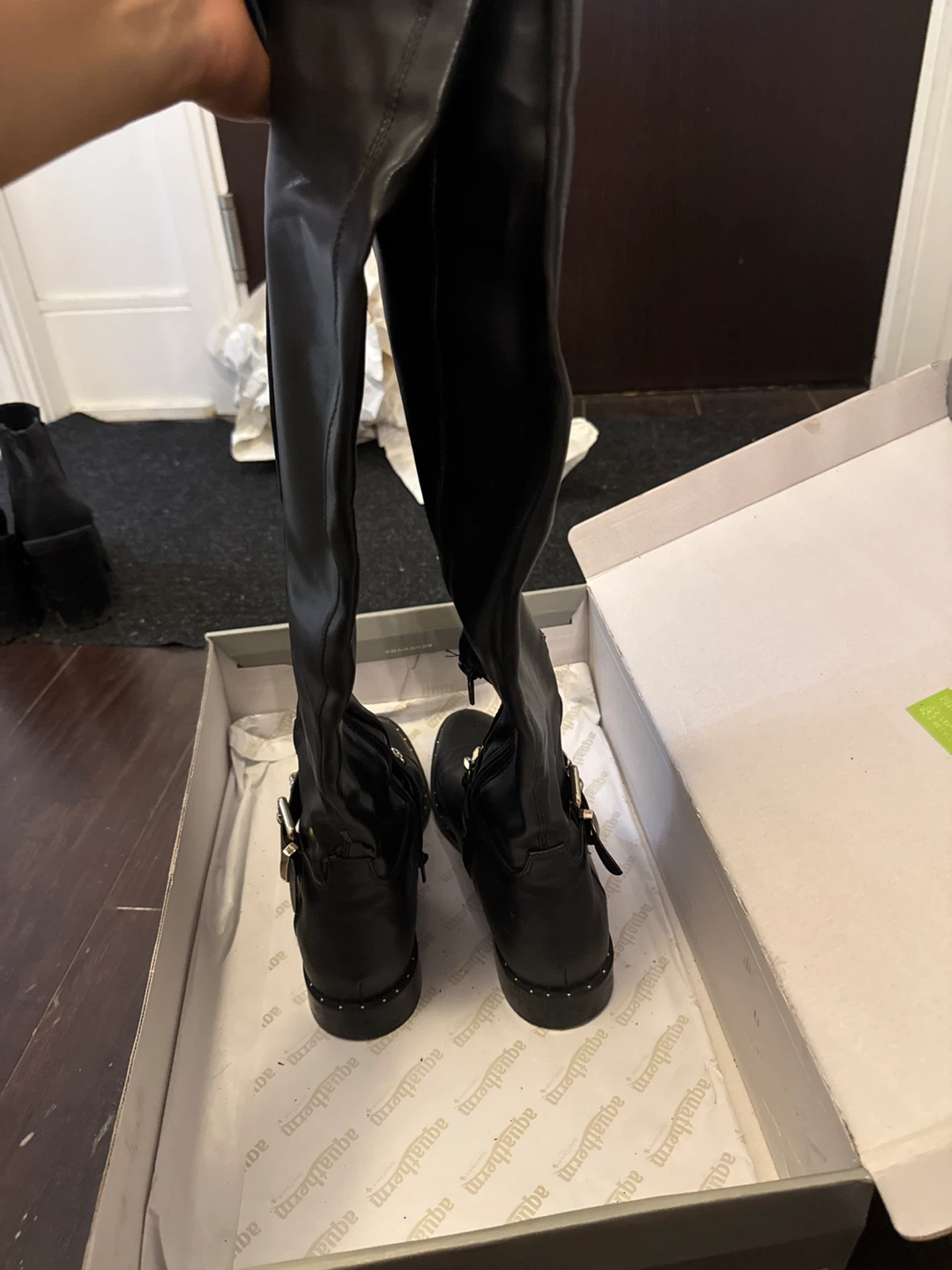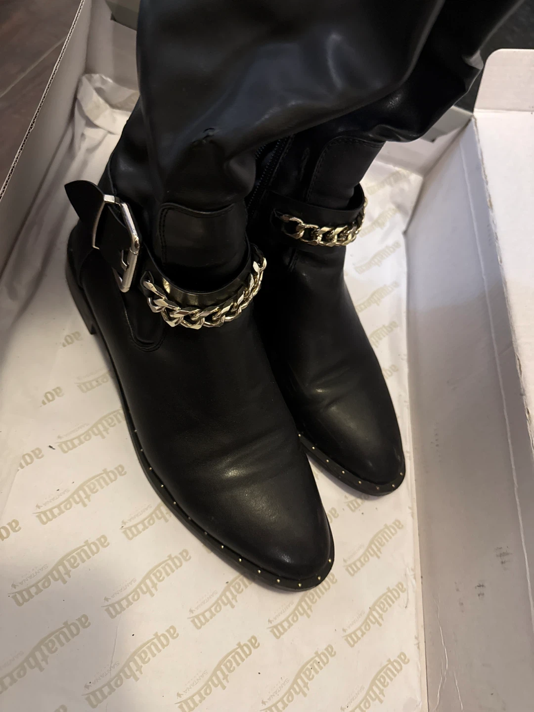 These black over-the-knee boots are super stylish! They feature a chic chain detail and come in a box. Perfect for adding a bit of edge to any outfit