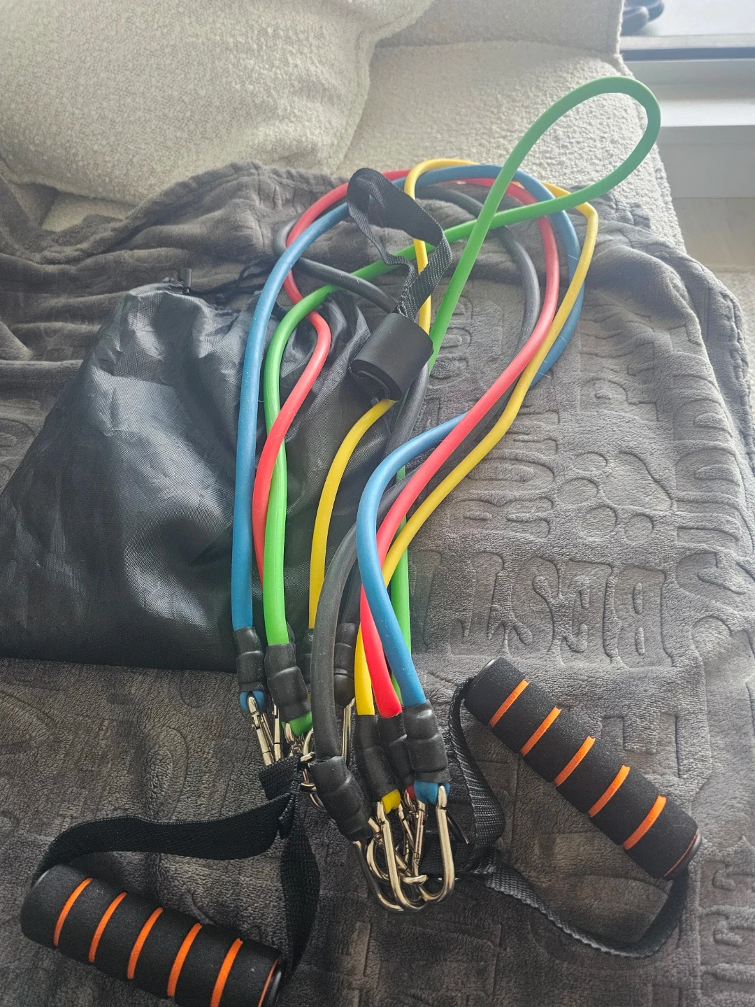 This set includes multiple resistance bands in various colours. It comes with two handles and a convenient carrying bag. The bands are made of durable latex.