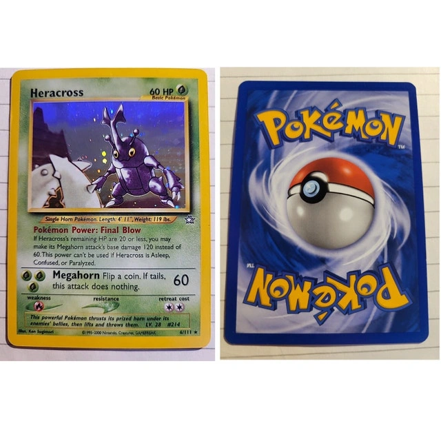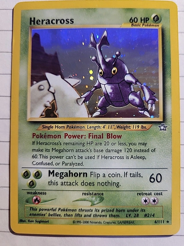 Selling a used Heracross Pokemon card, a nostalgic find for collectors! This card has been kept safe but shows some wear, as you might expect from a card that's been around the block a few times. Perfect for adding a bit of vintage charm to your collection! Why not give this classic card a new home? It's looking for someone who appreciates the thrill of the game and the artistry of Pokémon. If you're seeing this ad, yes, the card is still available, ready to leap into your eager hands!