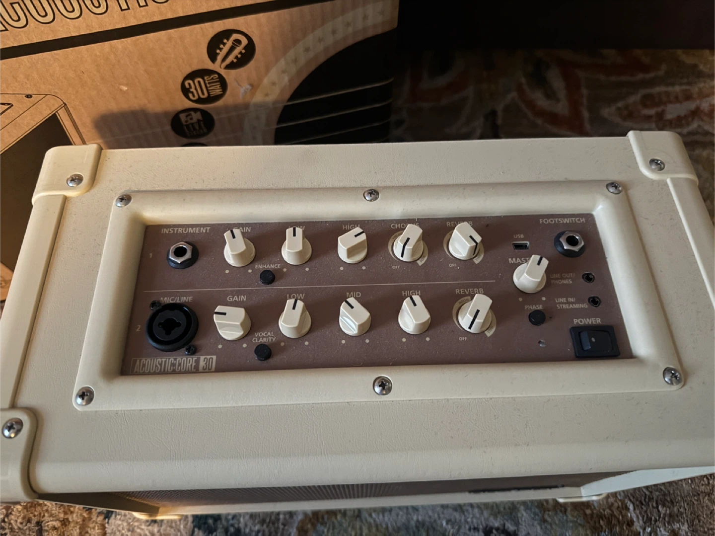 Selling a Blackstar Acoustic:Core 30 amplifier. It's in good condition and comes with the box! There are some visible scratches. This amp is great for acoustic instruments and vocals. Has a little crack in the tolex. Very low usage!