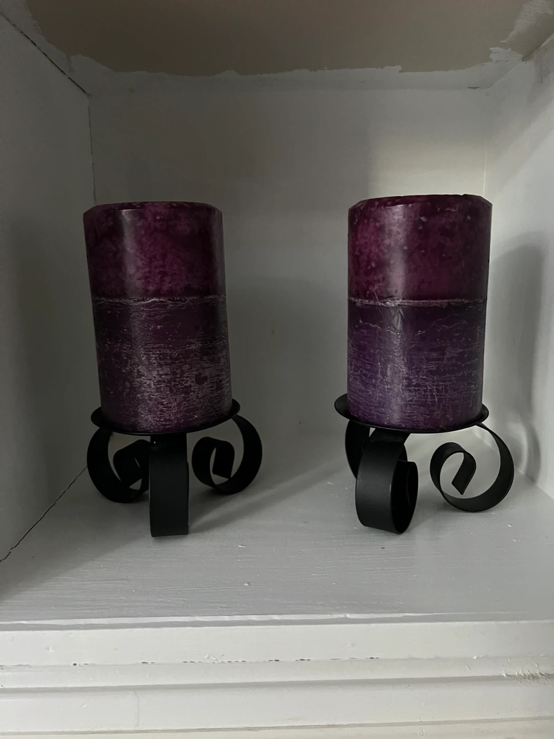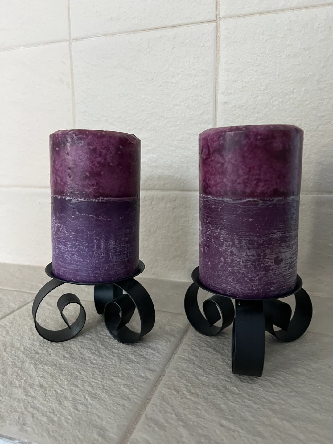 Includes two purple pillar candles, each with a unique distressed finish. They sit on decorative black metal candle holders with scroll accents. These holders add a touch of elegance to any space. Perfect for creating ambiance in your home!