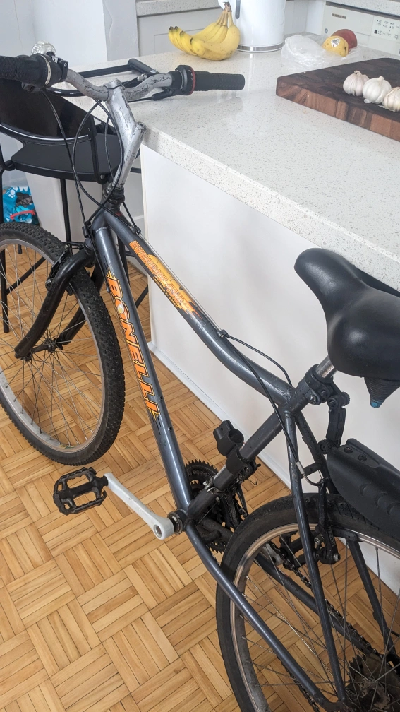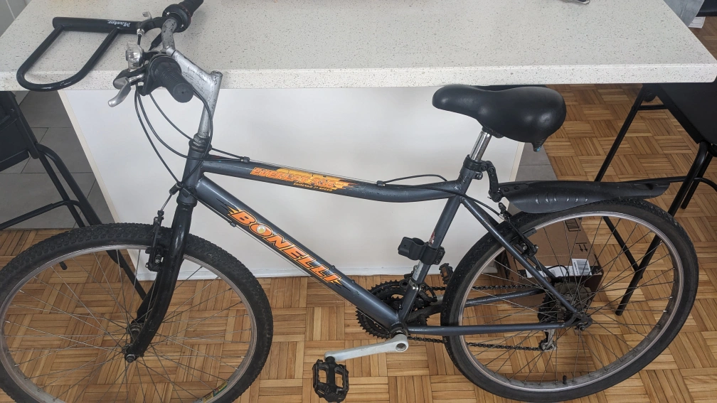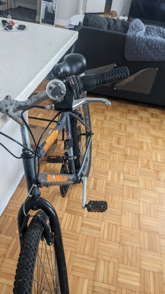 Mountain bike with bike lock, bell and fenders. In relatively good condition, I used it last year to commute but I'm moving so I need to get rid of it! Could use a tune up on the front brake but the back brake works just fine.