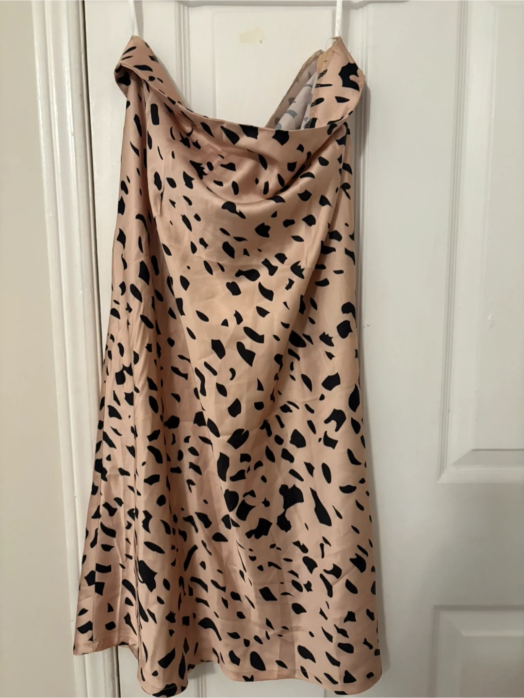 This stylish slip skirt features a satin fabric with a chic leopard print. It has a midi length and a flattering silhouette. Perfect for dressing up or down!