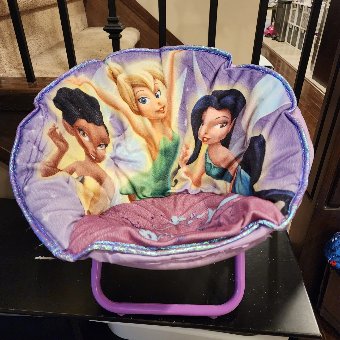 Here's a cute saucer chair featuring Disney Fairies! It's in great shape and perfect for a little one's room or play area. The purple colour is vibrant, and the fairy design is sure to be a hit with any Disney fan