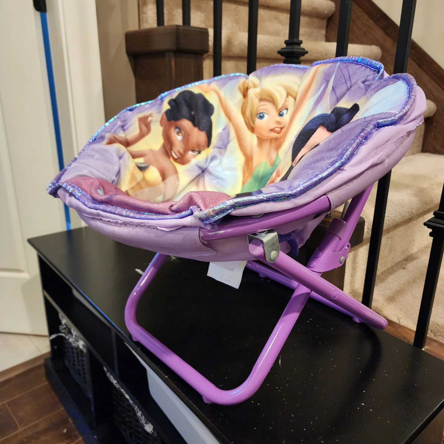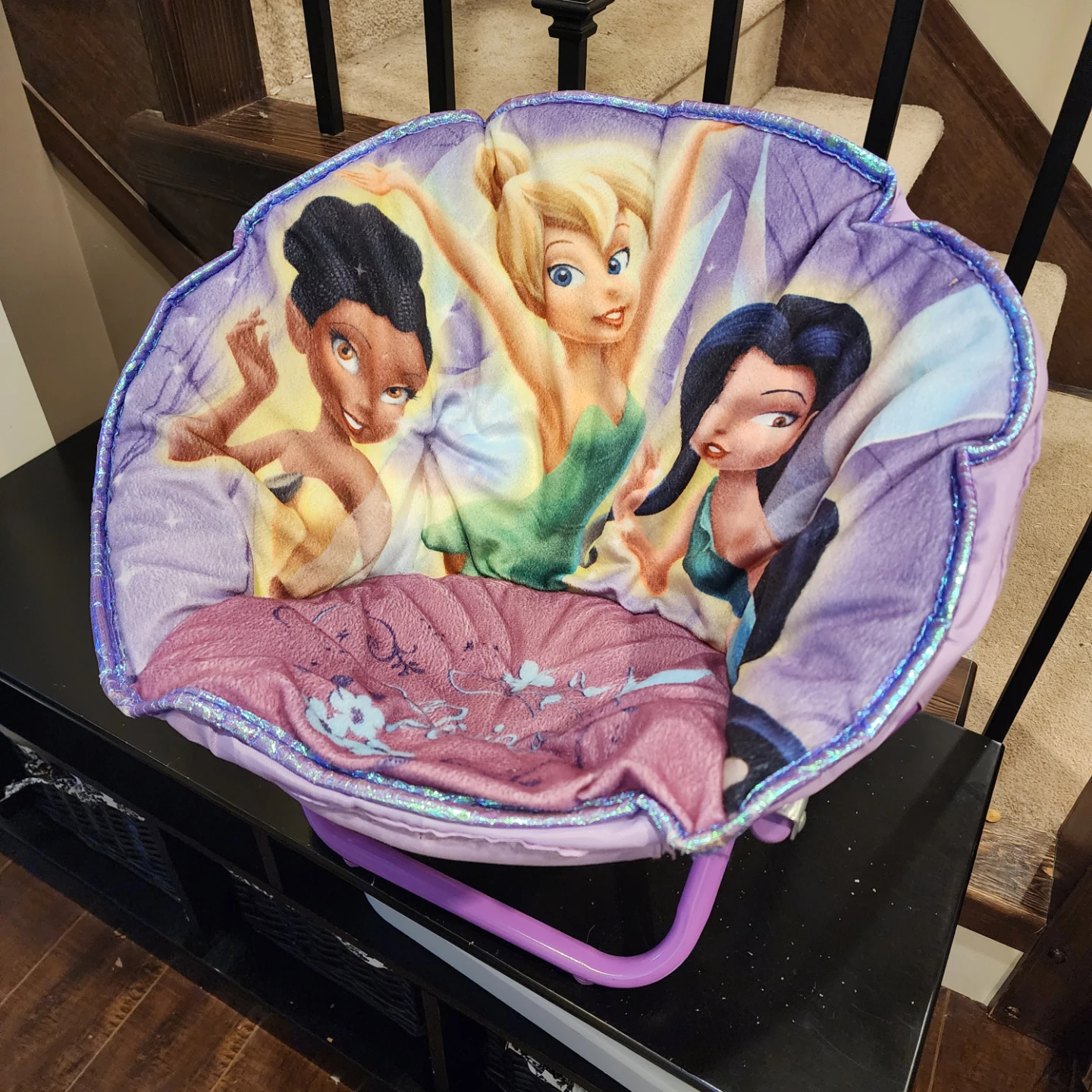 Here's a cute saucer chair featuring Disney Fairies! It's in great shape and perfect for a little one's room or play area. The purple colour is vibrant, and the fairy design is sure to be a hit with any Disney fan