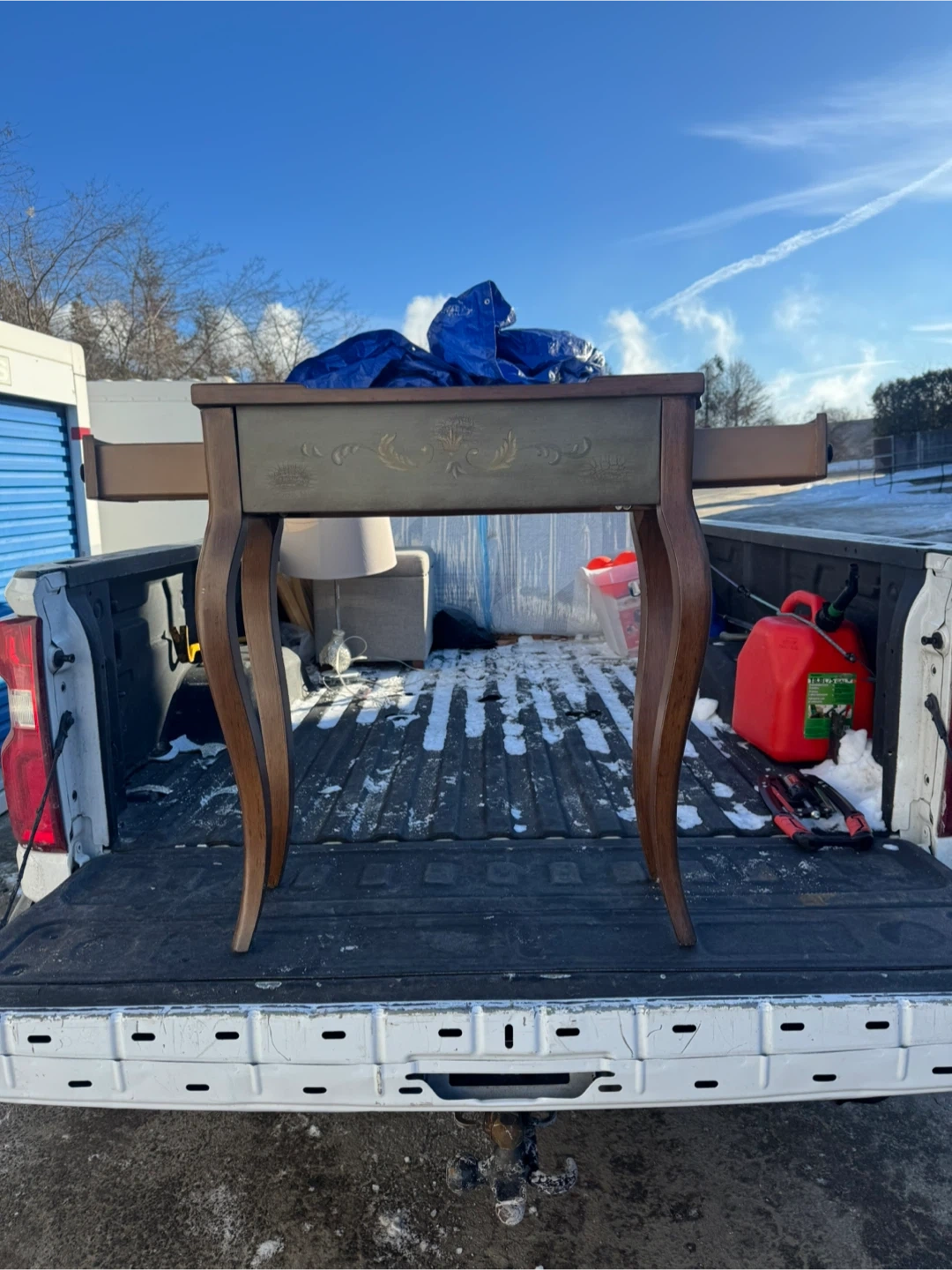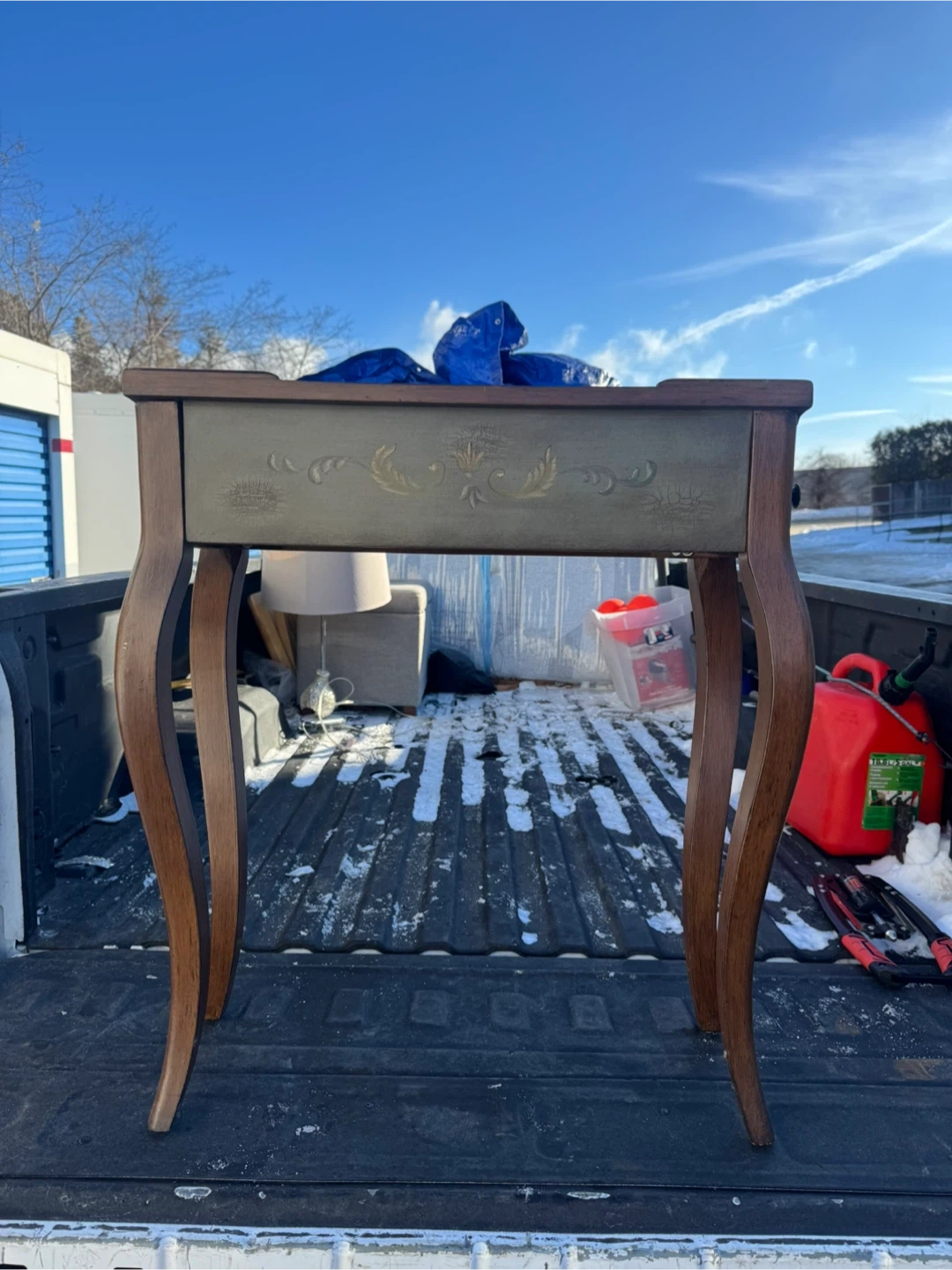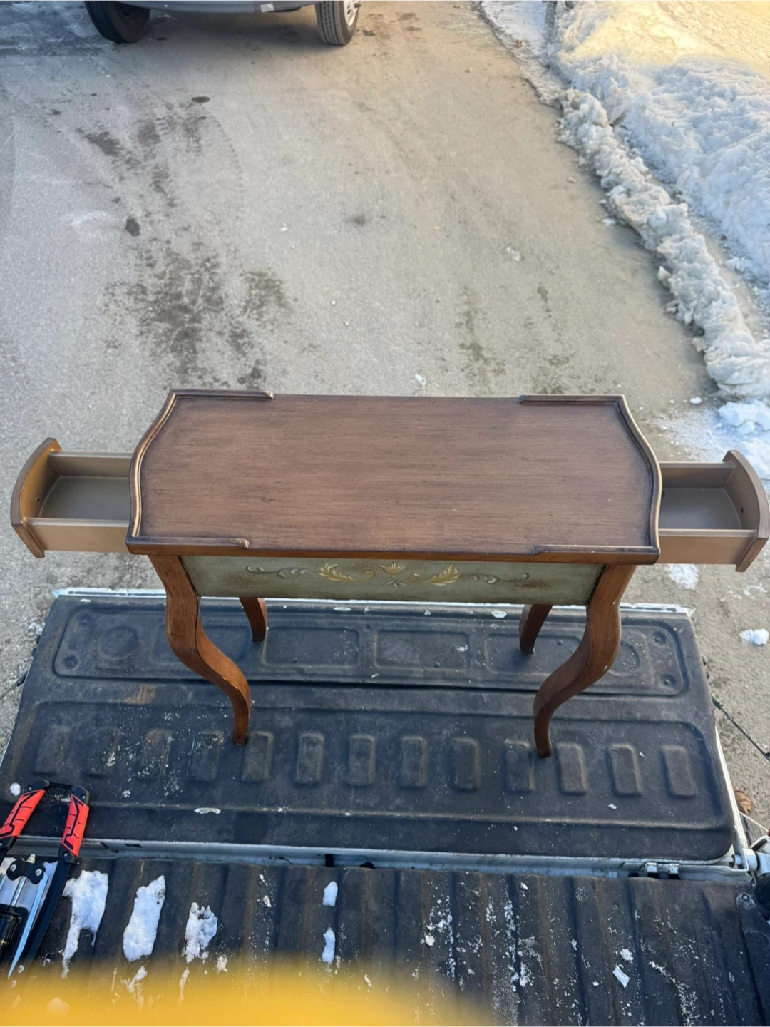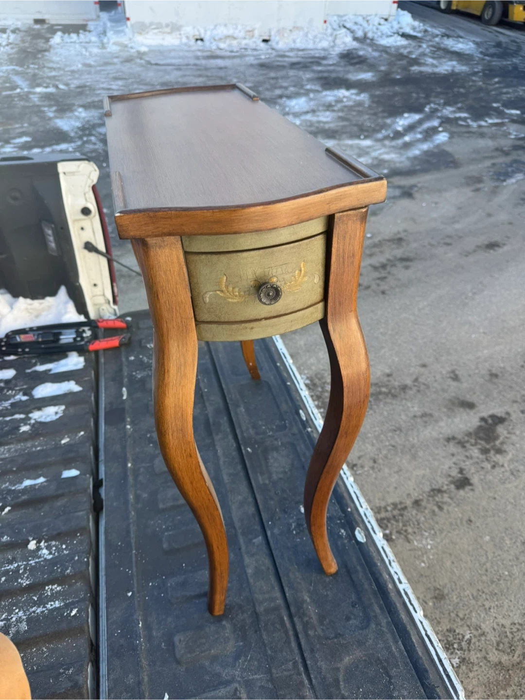 This is a lovely accent table with 2 drawers. It features elegant curved legs and a decorative panel on the drawer front. The tabletop appears to be a dark wood finish, and the drawer front has a muted green color with gold detailing. It's a great piece for an entryway or hallway!