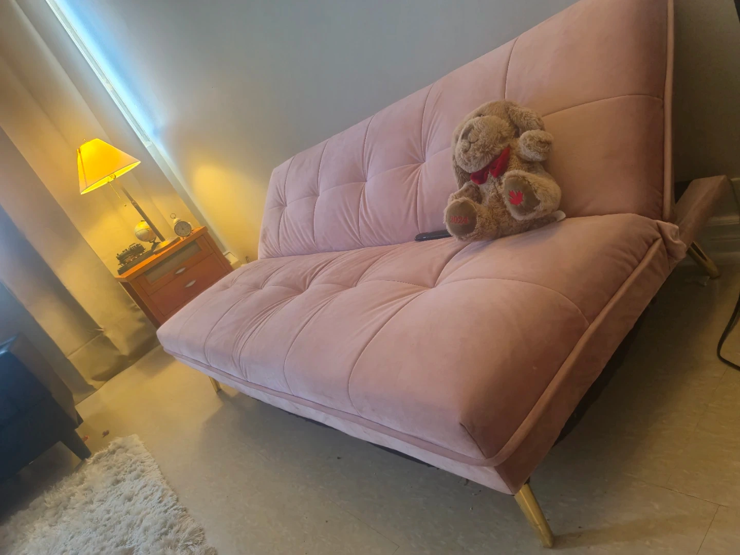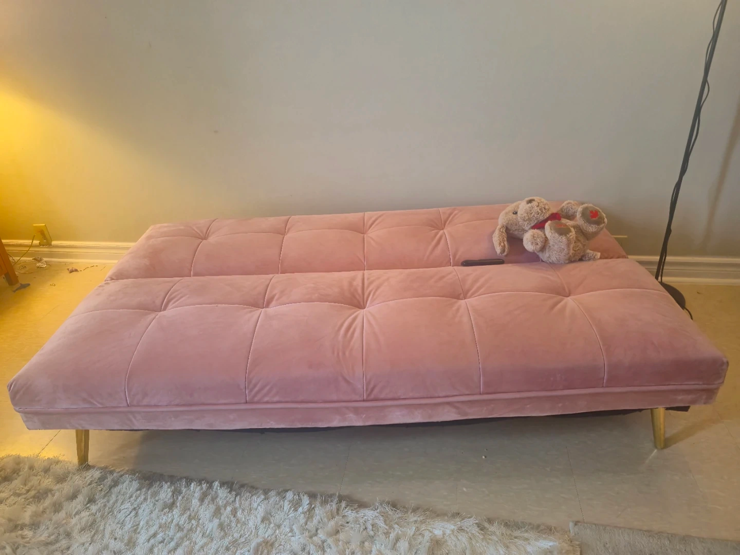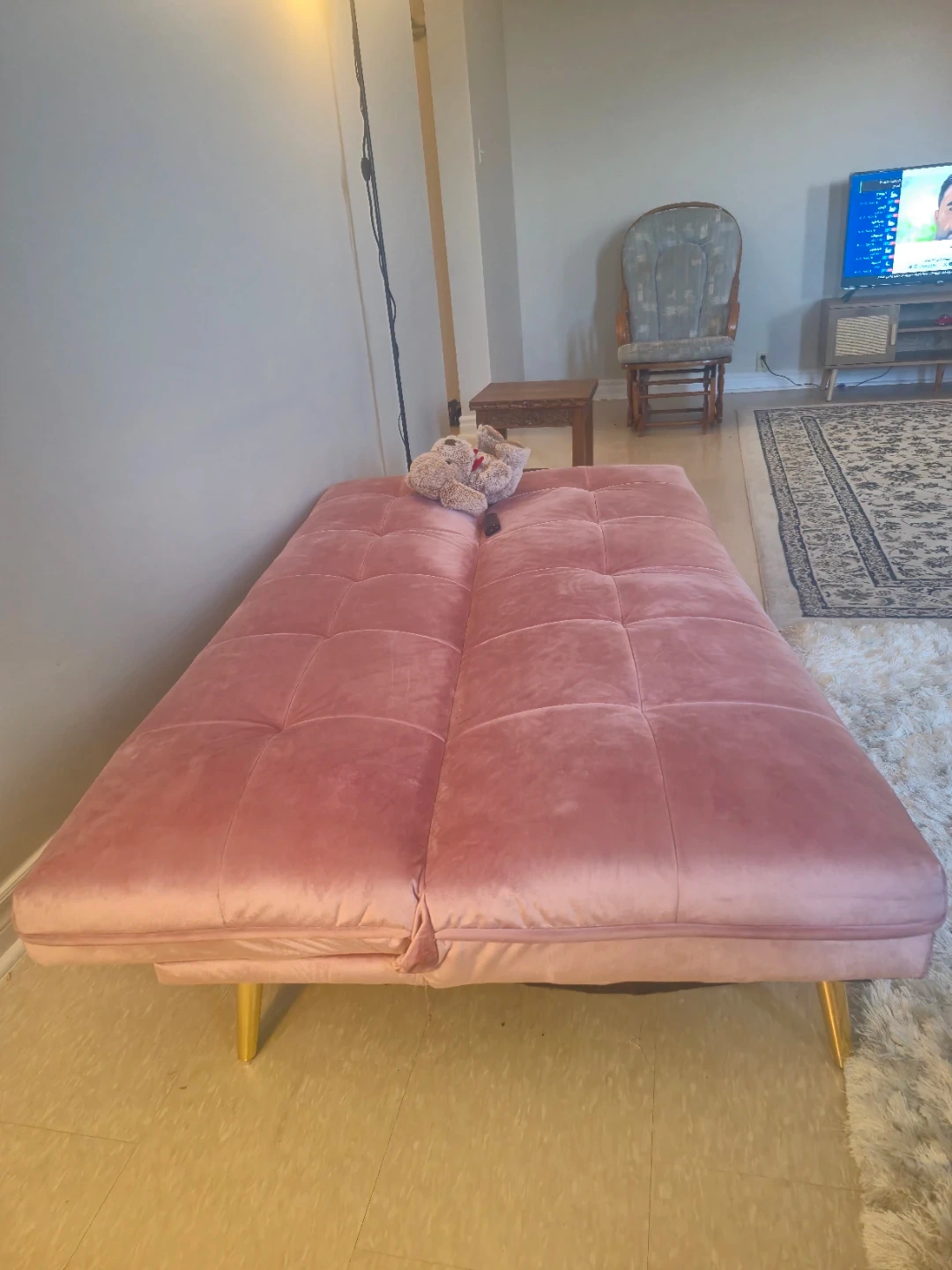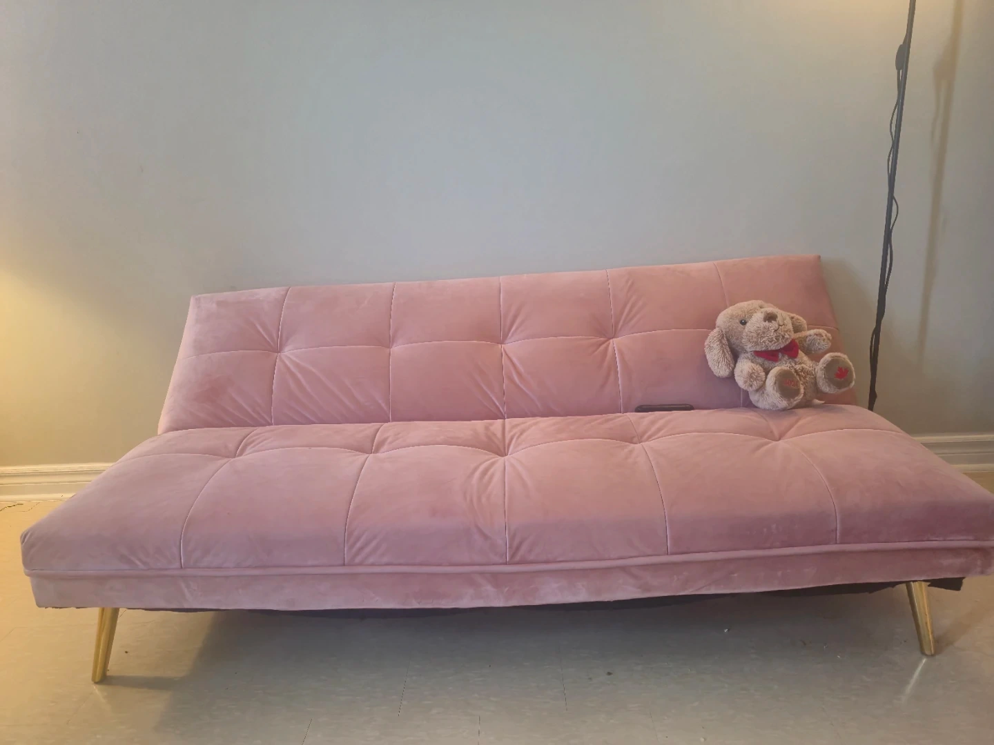 Selling a comfy pink velvet futon! It's in great condition and would be perfect for a living room or guest room. The gold legs add a touch of elegance, and the velvet material is so soft to the touch