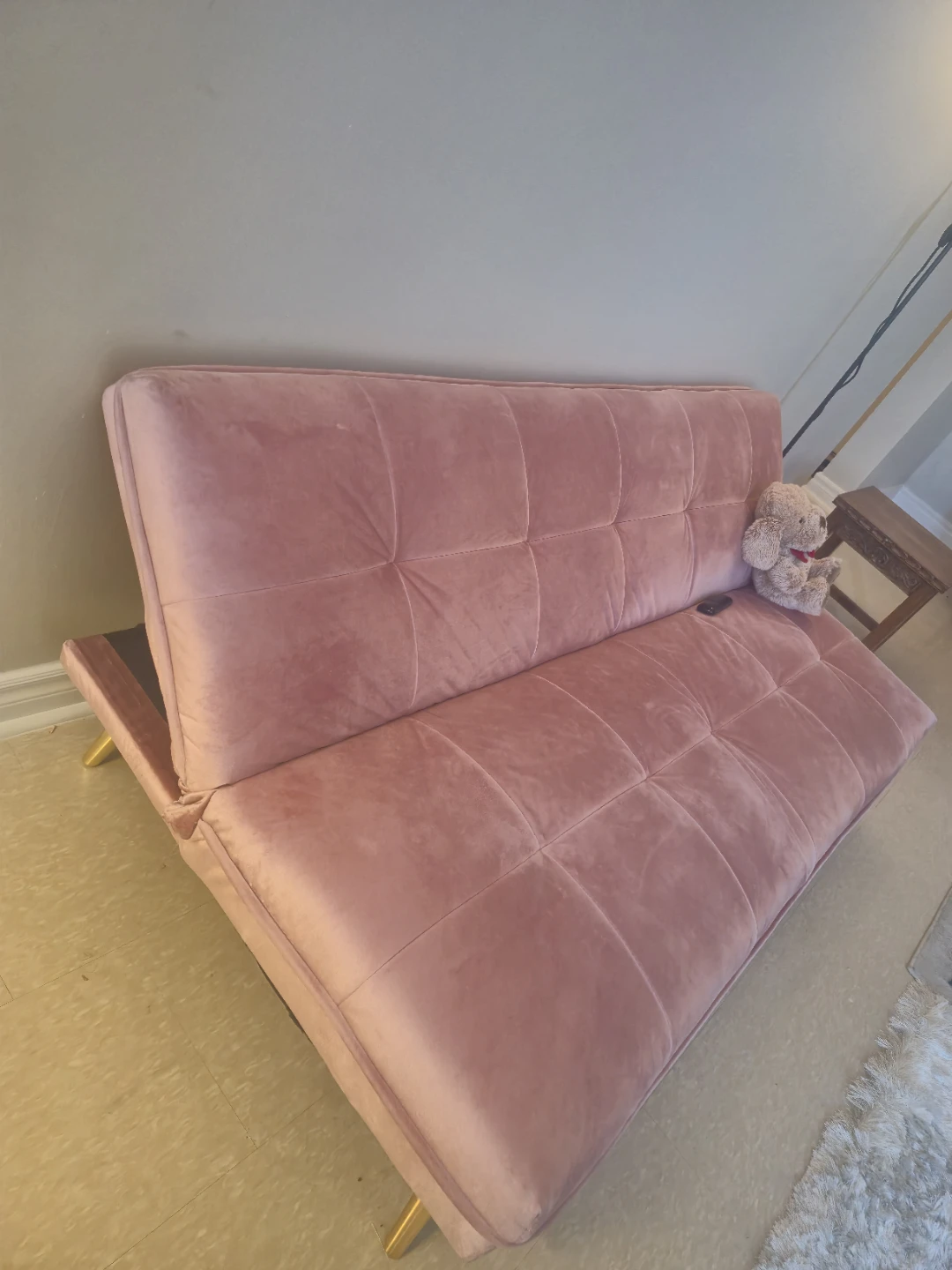 Selling a comfy pink velvet futon! It's in great condition and would be perfect for a living room or guest room. The gold legs add a touch of elegance, and the velvet material is so soft to the touch