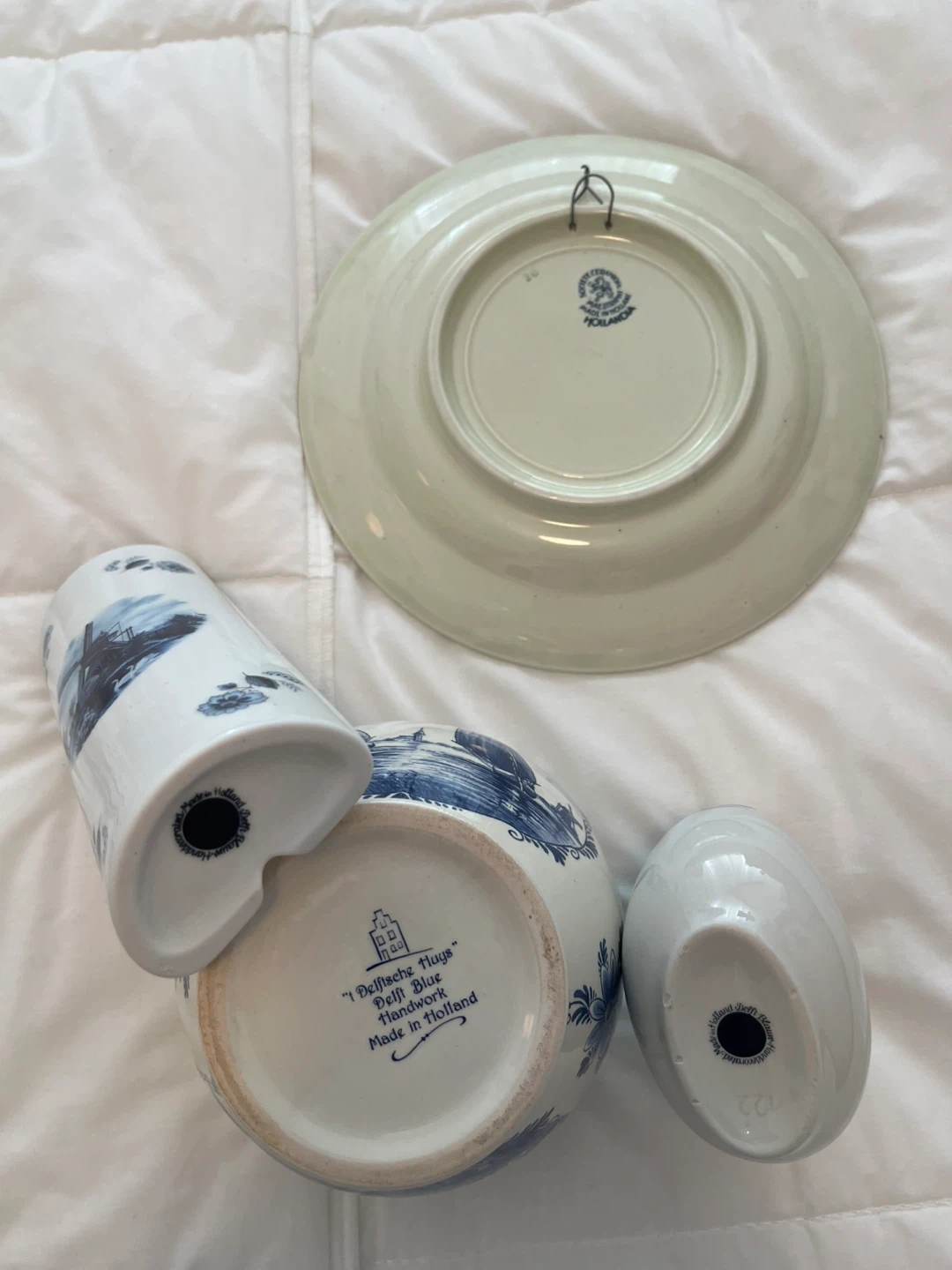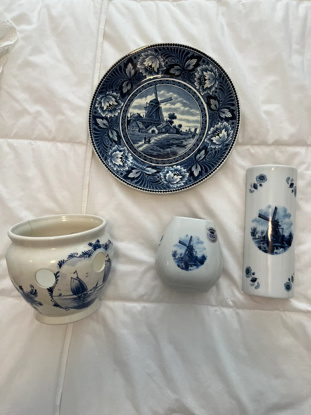 This set includes a decorative plate, a small vase, and a pot, all featuring classic Delft Blue windmill and sailing ship designs. They are made from ceramic in Holland. This collectible ceramicware would add a touch of Dutch charm to any home decor.