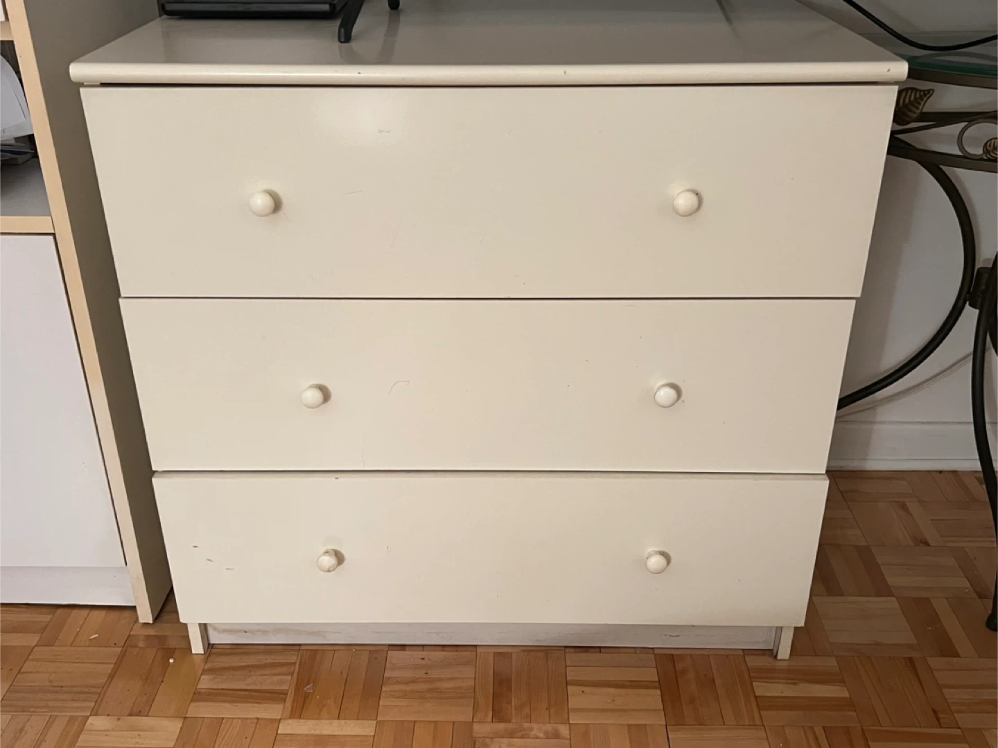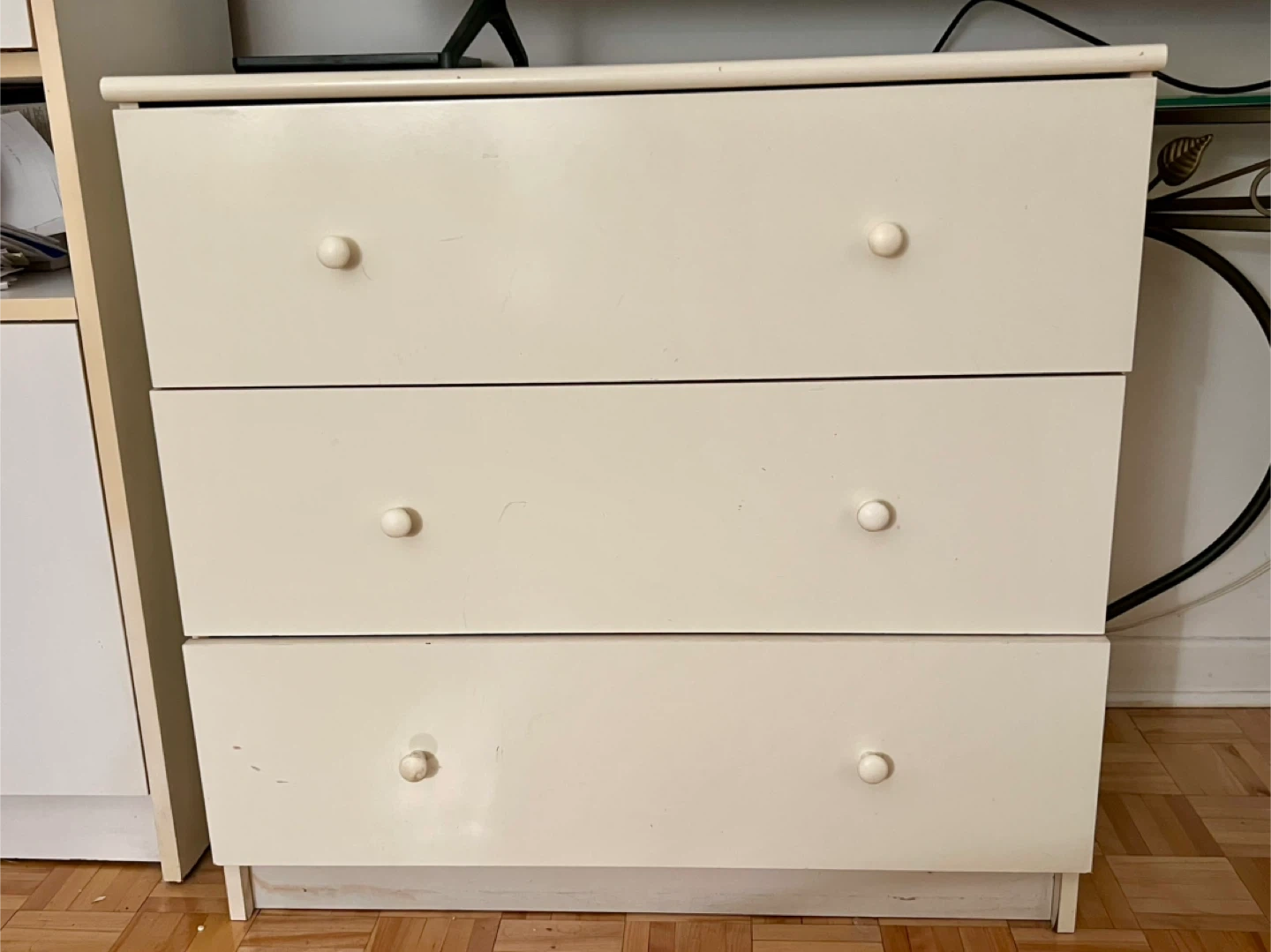 Selling a three-drawer dresser in an off-white colour. It's in good condition and perfect for adding some extra storage to any room in your home