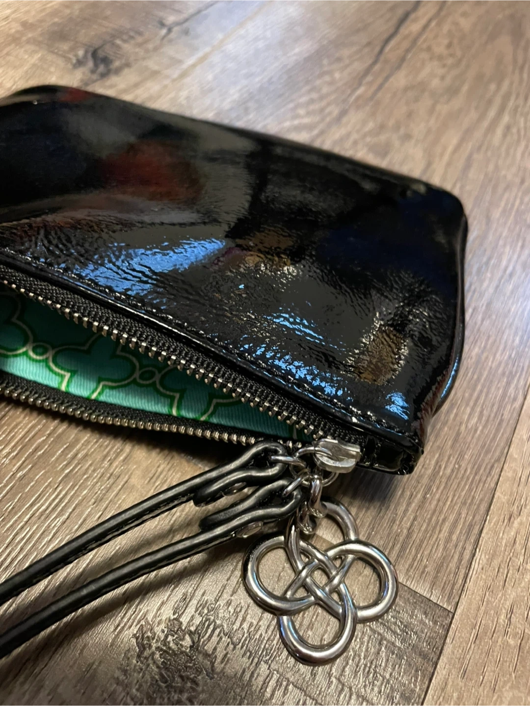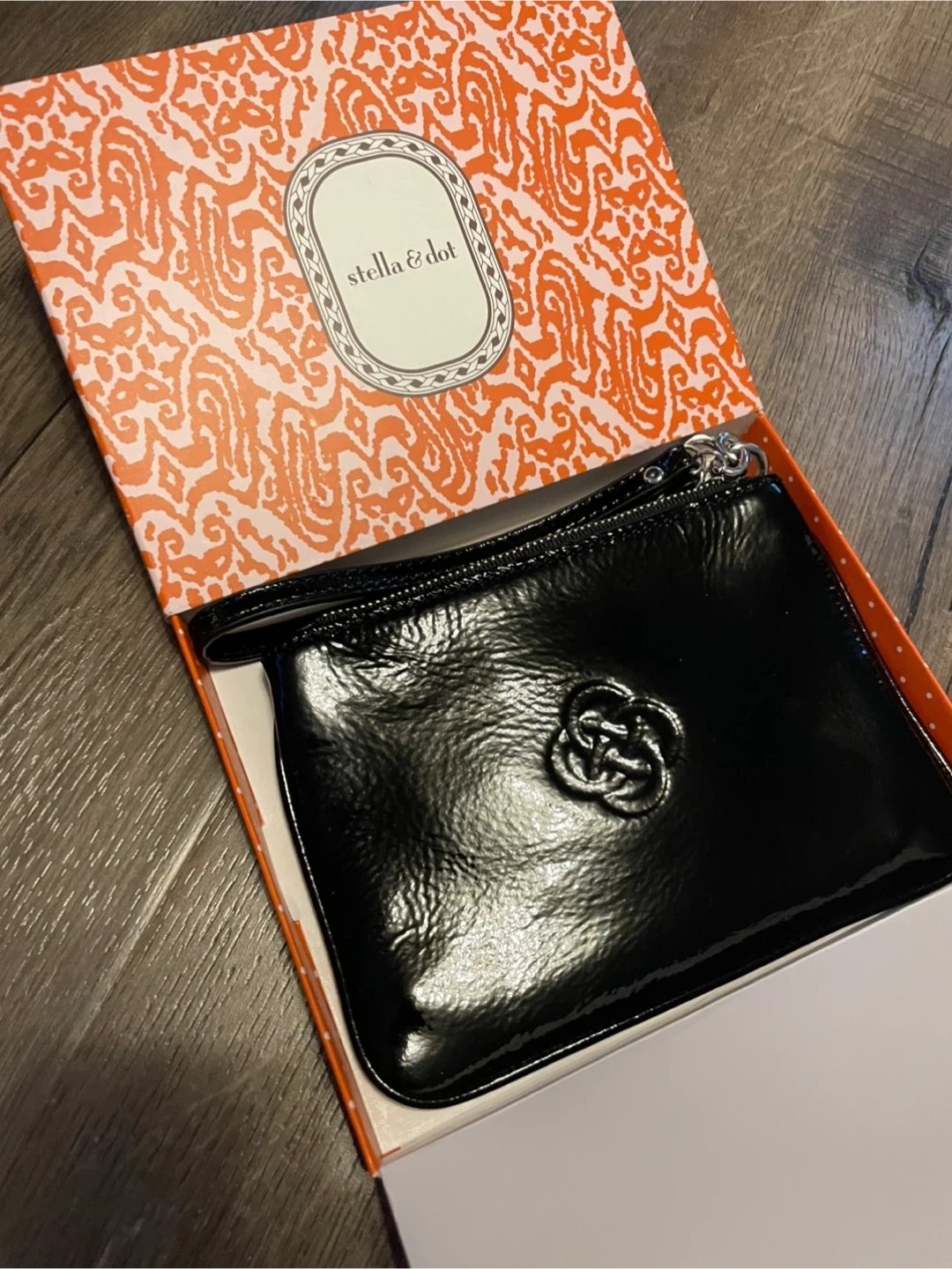 Downsizing my accessories closet. Add chic to any outfit with this Stella & Dot Soho wristlet clutch made from crinkle black patent leather. It features a zippered closure, a shiny nickel clover pull and a convenient wrist strap. Magnificent wristlet featuring a vibrant teal interior. It is in new condition. Includes the original box and care card. Original retail price $74. Sleek design & gift ready. Approximate dimensions 4.5 in x 6.5 in.