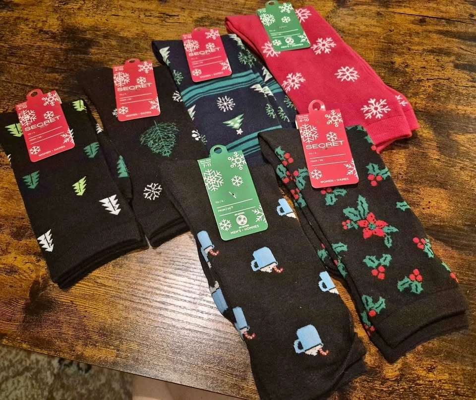 Brand new, giftable holiday socks. 6 pairs in total for $10. 4 pairs are size 4-10 adult women's and 2 pairs are size 7-11 men's. Derry & McLaughlin brand.