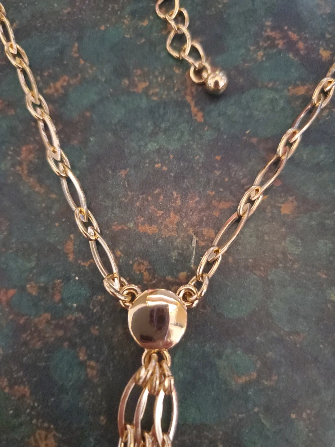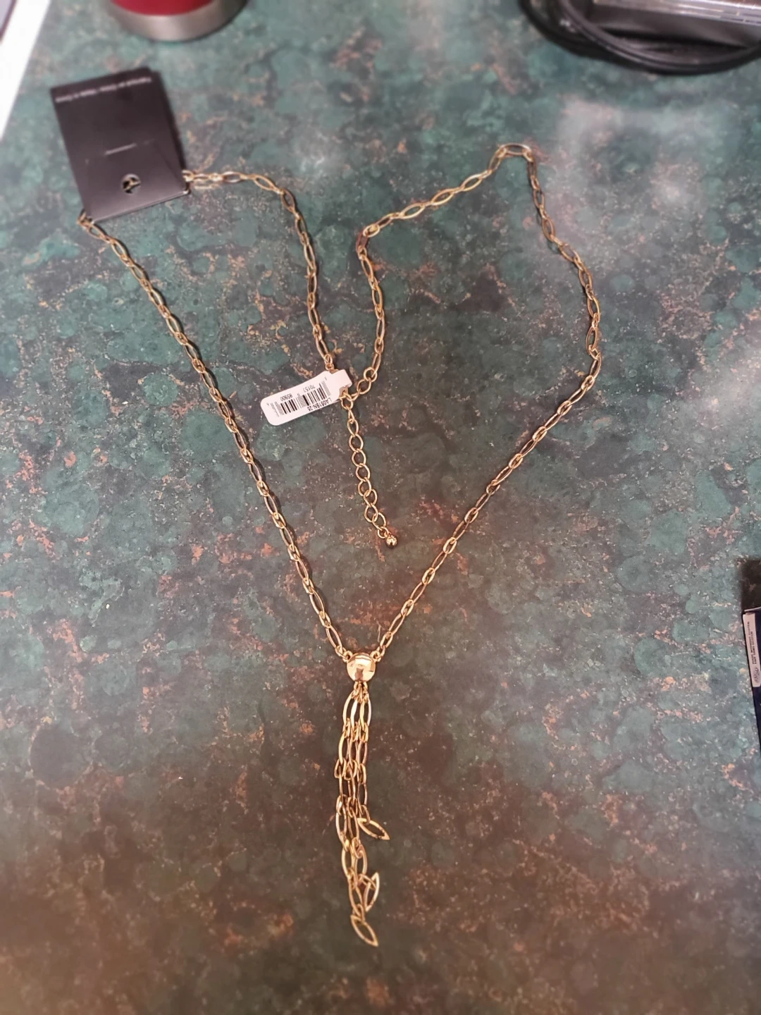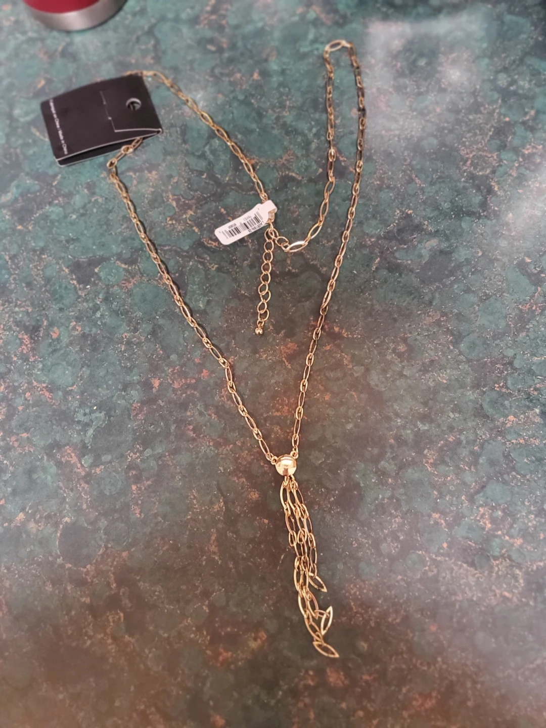 This gold tone pendant necklace features a delicate chain with a tassel-like pendant. It has an adjustable clasp for a customized fit. The chain links are an oval open-link style, and the pendant has a subtle leaf-like design. It comes with its original tag attached. Cedar pick up