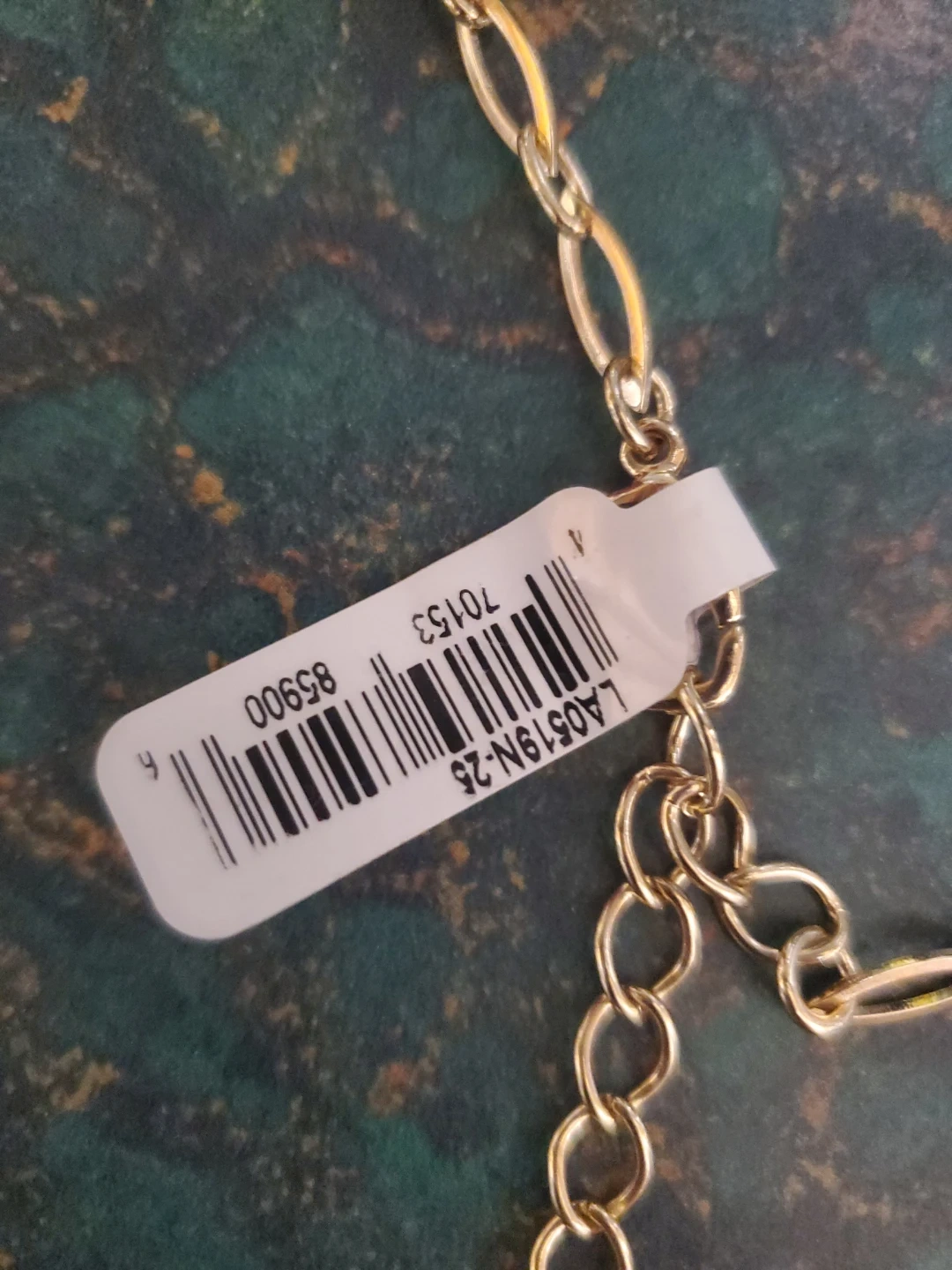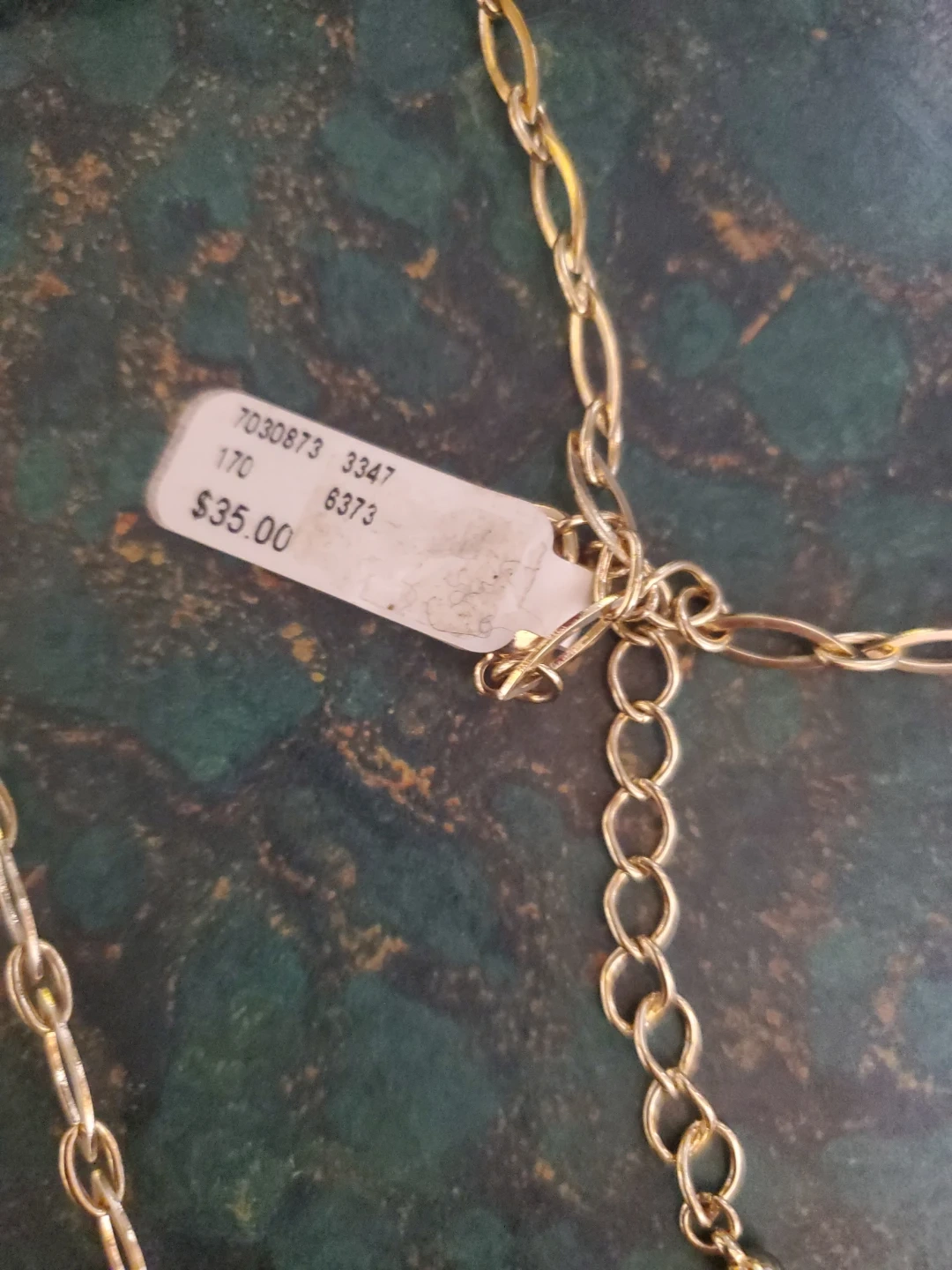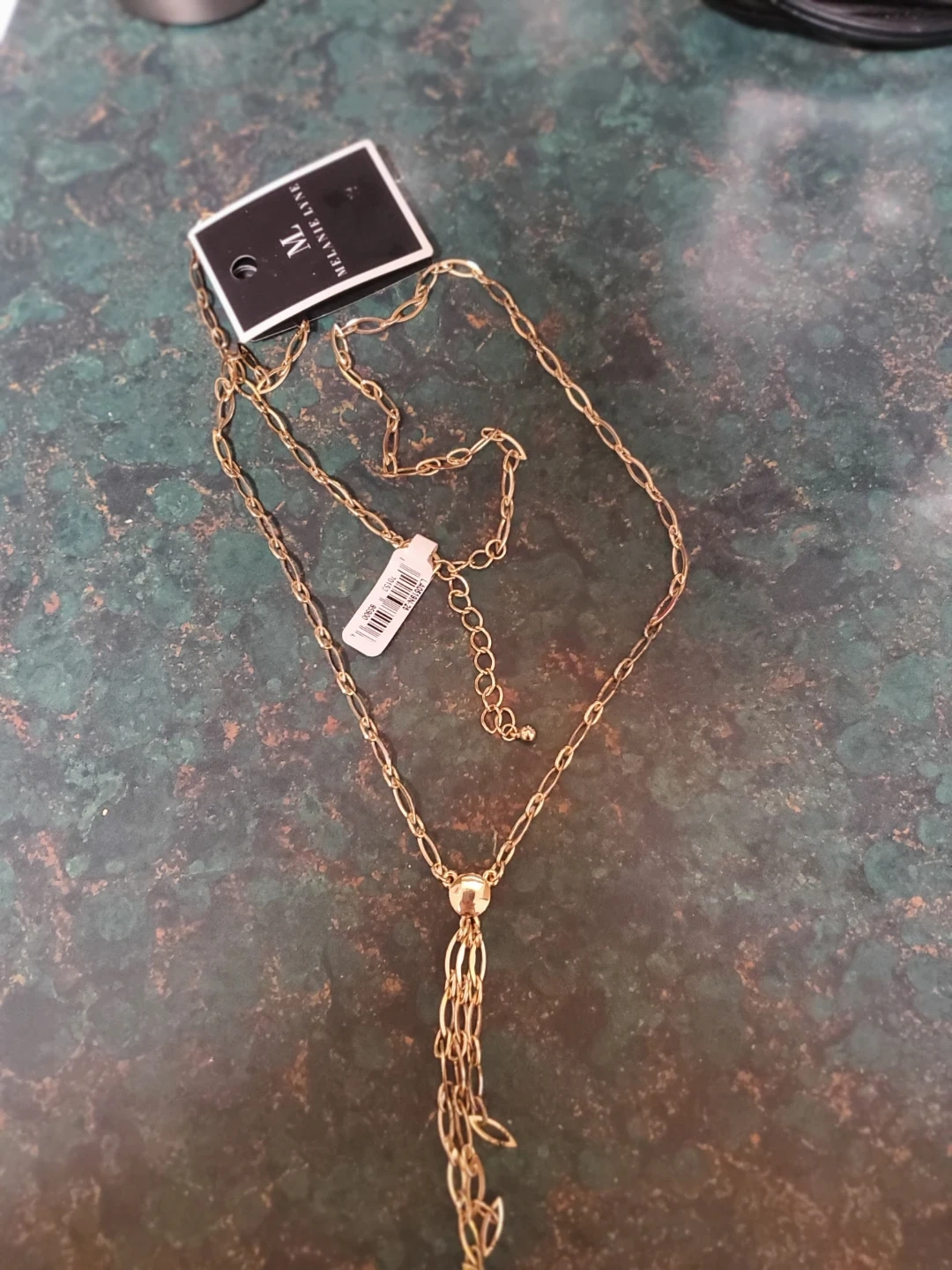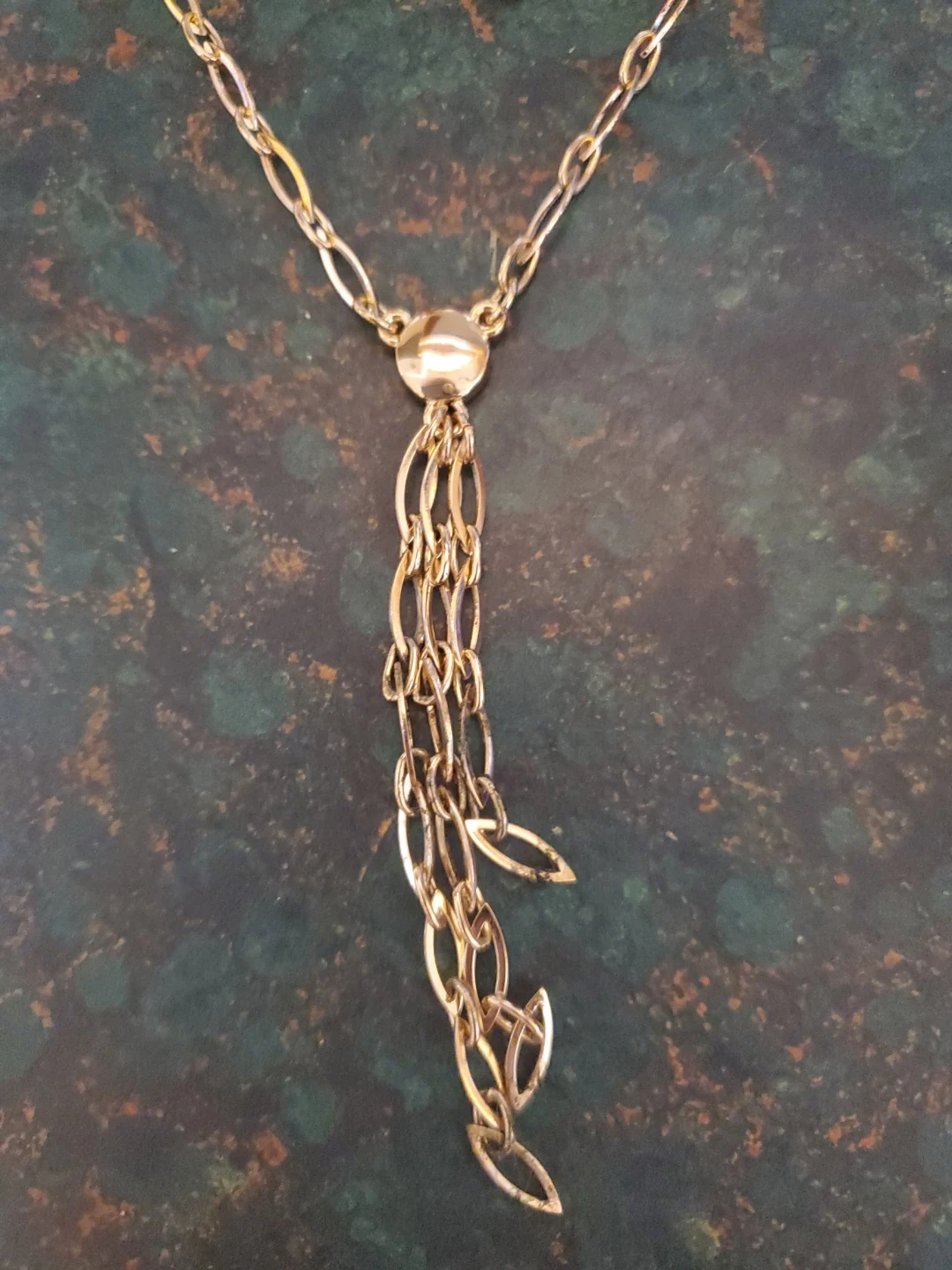 This gold tone pendant necklace features a delicate chain with a tassel-like pendant. It has an adjustable clasp for a customized fit. The chain links are an oval open-link style, and the pendant has a subtle leaf-like design. It comes with its original tag attached. Cedar pick up