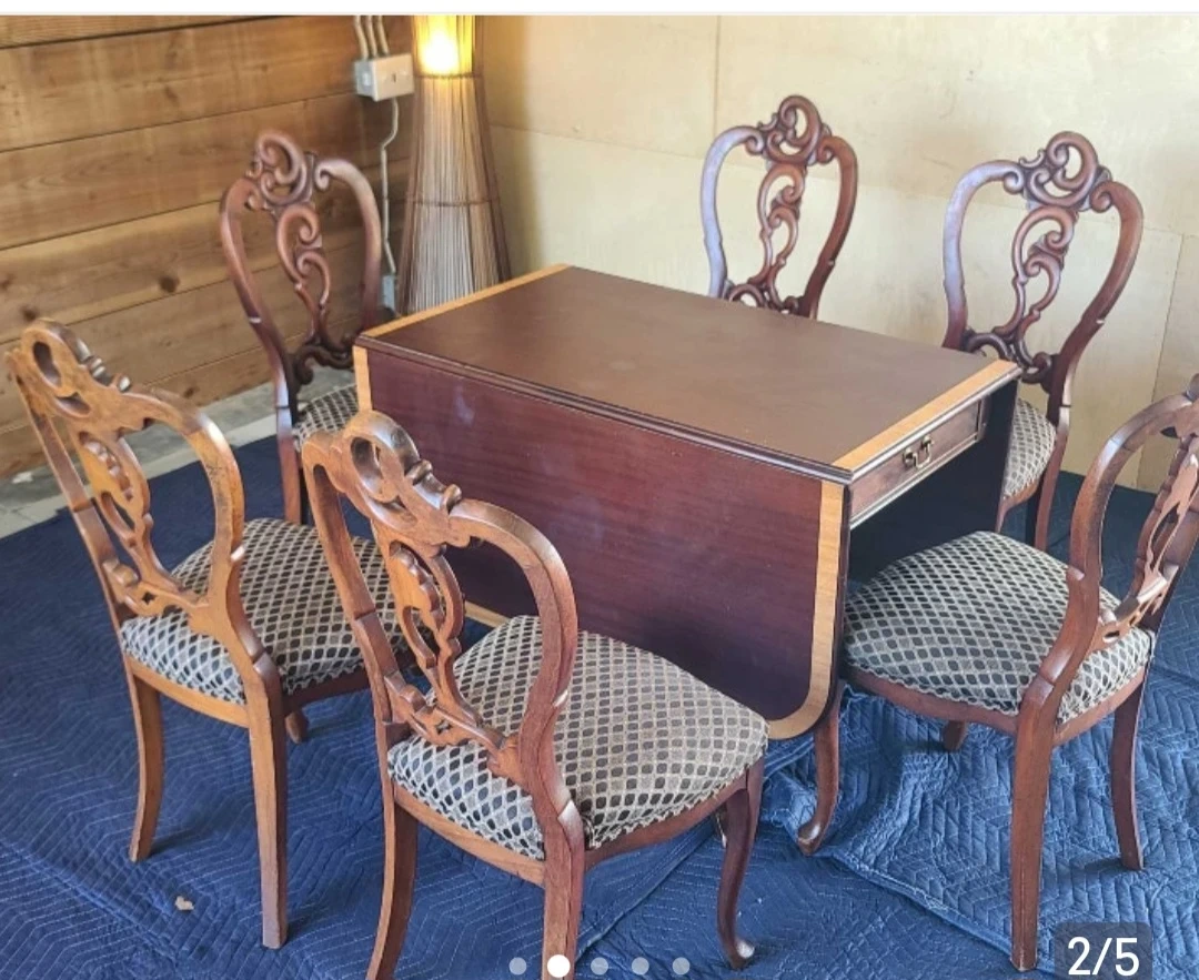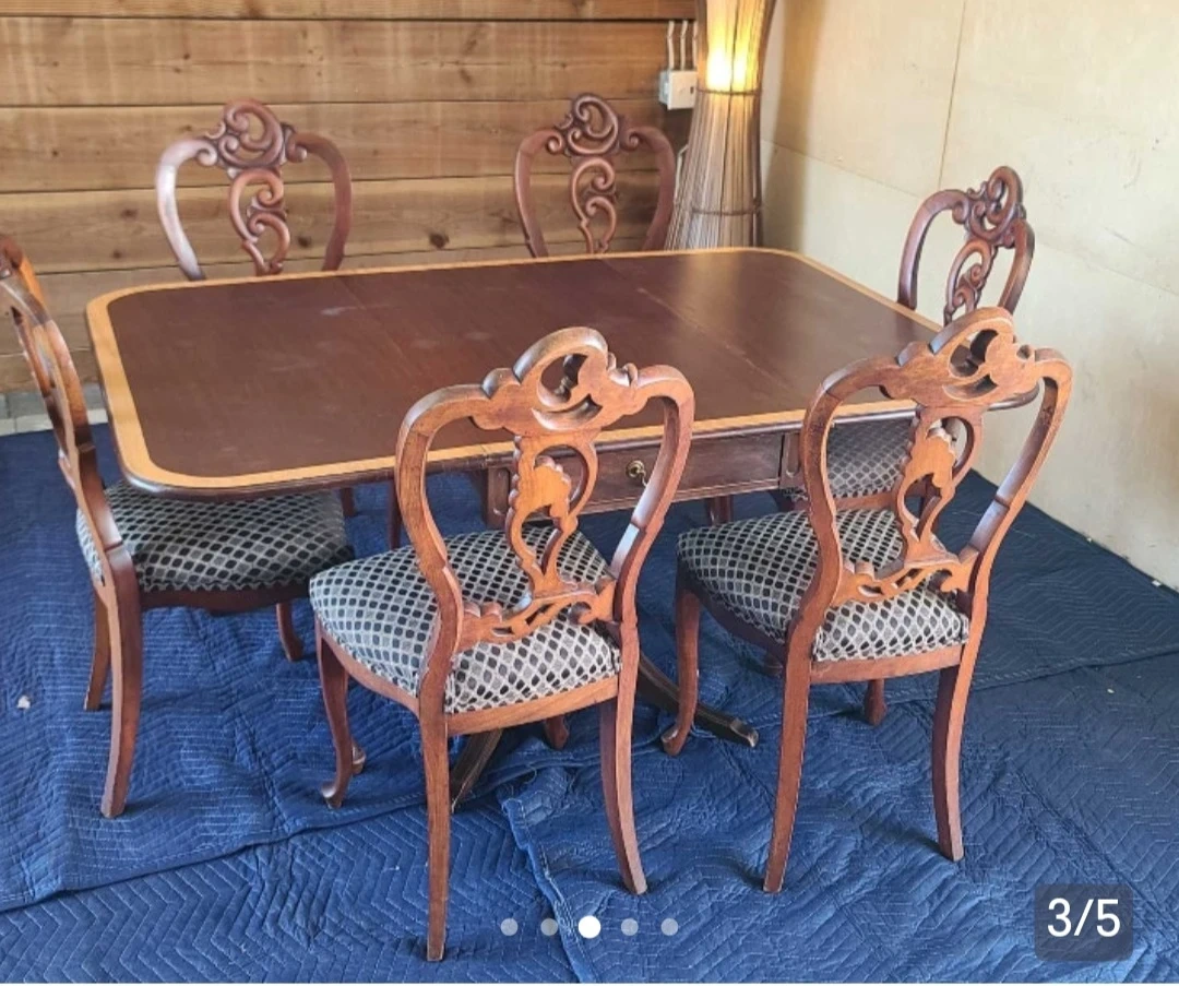 Beautiful antique dining table set, including six chairs with ornate detailing! The table has a rich, dark wood finish and a unique design. The chairs have patterned upholstery that complements the table perfectly. This set would add a touch of elegance to any dining room! Delivery can be arranged. Viewing and pickup by appointment.