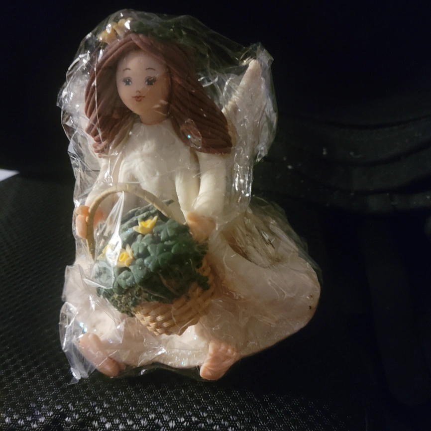 Adorable angel figurine. Part of the Kneaded Angels Barefoot Collection. Colleen figurine. Small, collectible angel holding a basket of flowers. New in box.