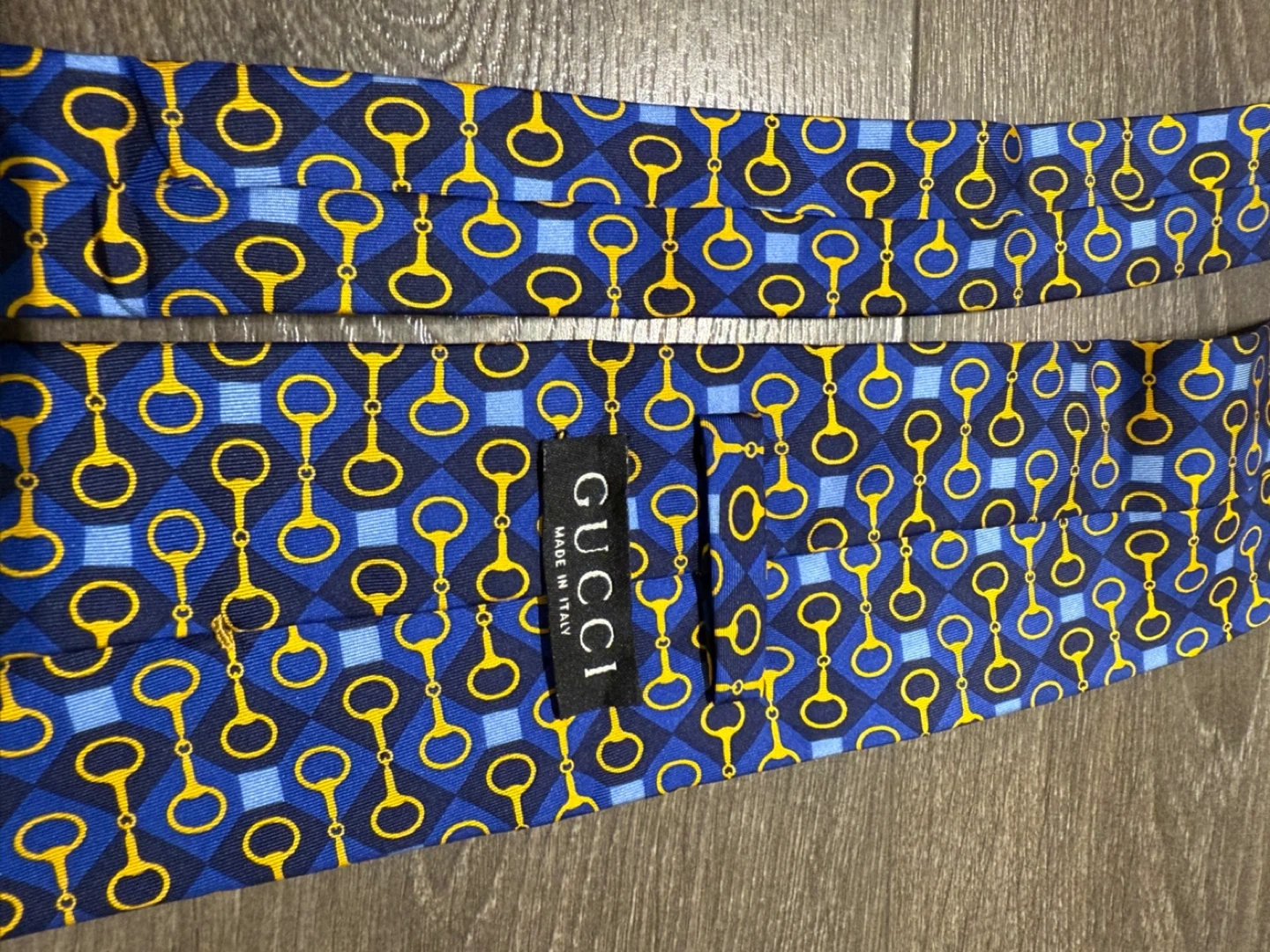 Authentic Gucci tie made from 100% silk. It features a unique blue and gold pattern that's sure to add a touch of class to any outfit. Made in Italy!