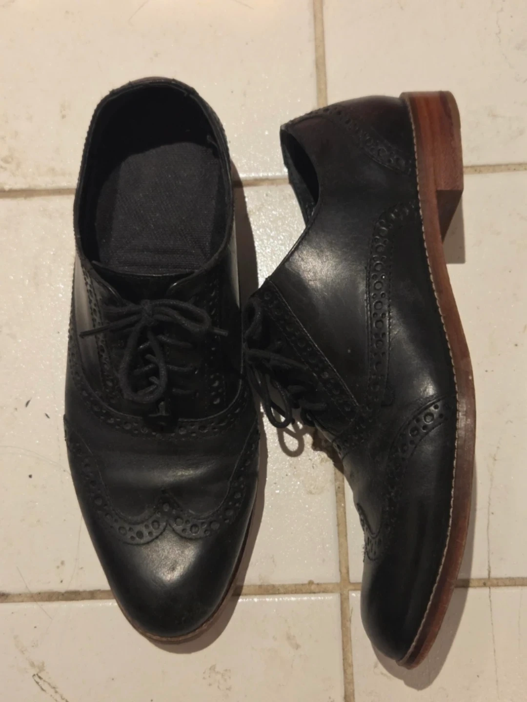 Classic black leather wingtip brogues for women. These shoes feature intricate broguing detail and a lace-up closure. They're made of genuine leather with a durable sole.