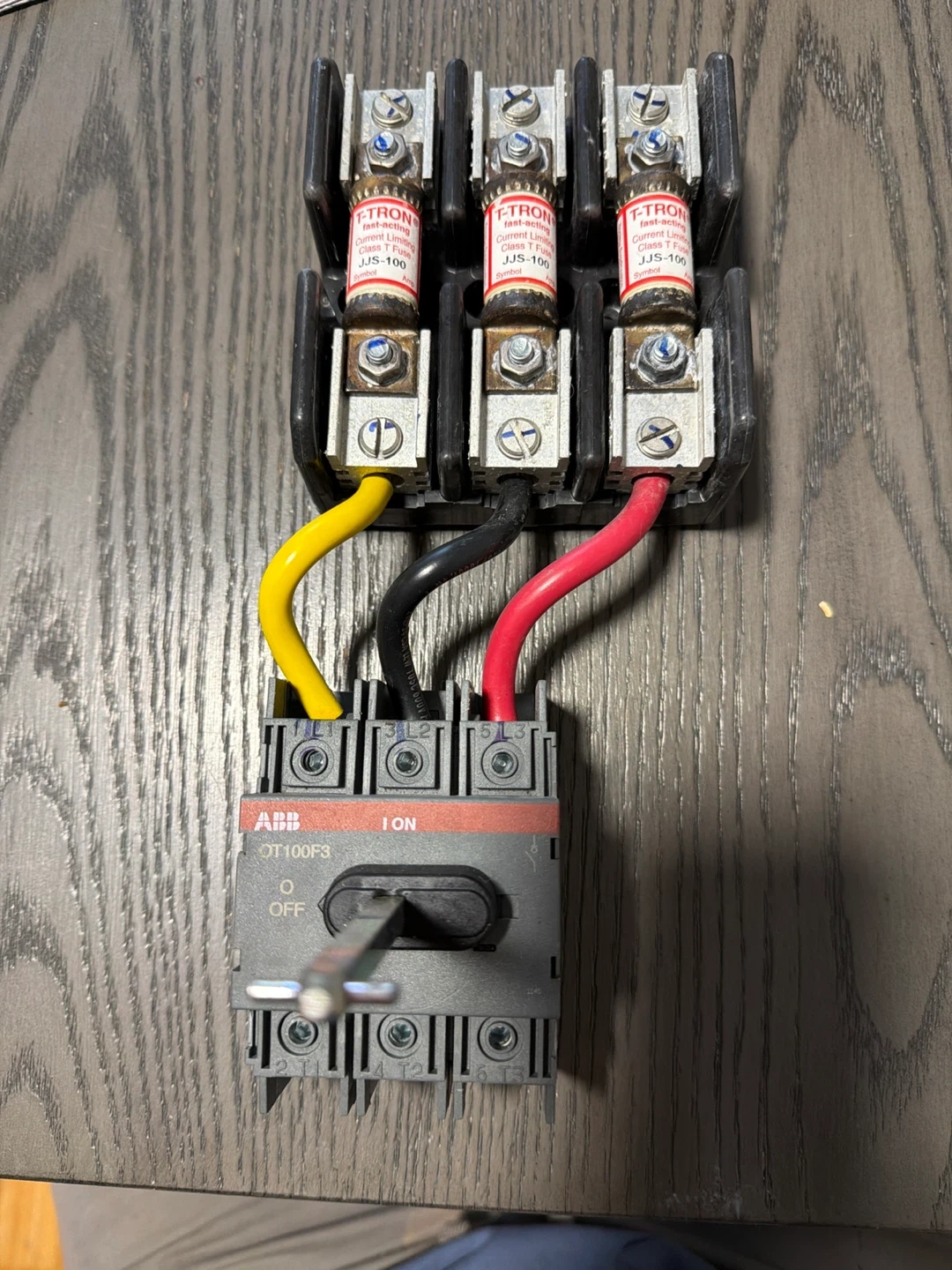 ABB OT100F3 3-pole disconnect switch. It comes with three T-TRON JJS-100 fast-acting, current-limiting Class T fuses. The switch has an ON and OFF position.