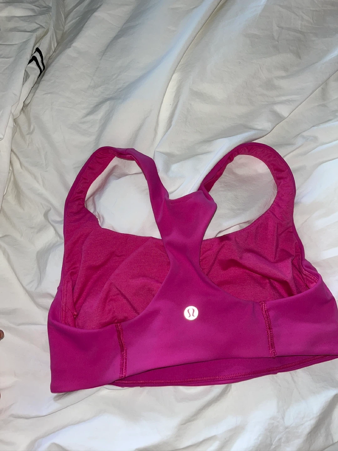 This is a Lululemon sports bra in a vibrant pink colour. It features a racerback design for support during workouts. Made from a comfortable, breathable fabric.