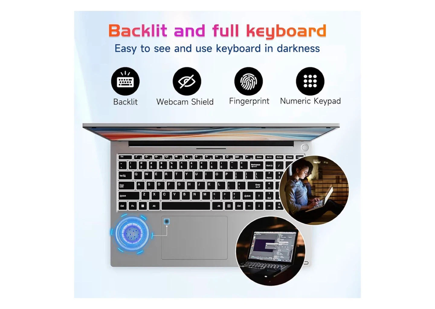 This 17.3-inch laptop features a 12th Gen Intel Core i3-1215U processor with 6 cores. It's equipped with a backlit keyboard, fingerprint reader, and a numeric keypad for enhanced usability. Includes a 65W Type-C PD charger that's compatible with laptops, tablets, and iPhones.