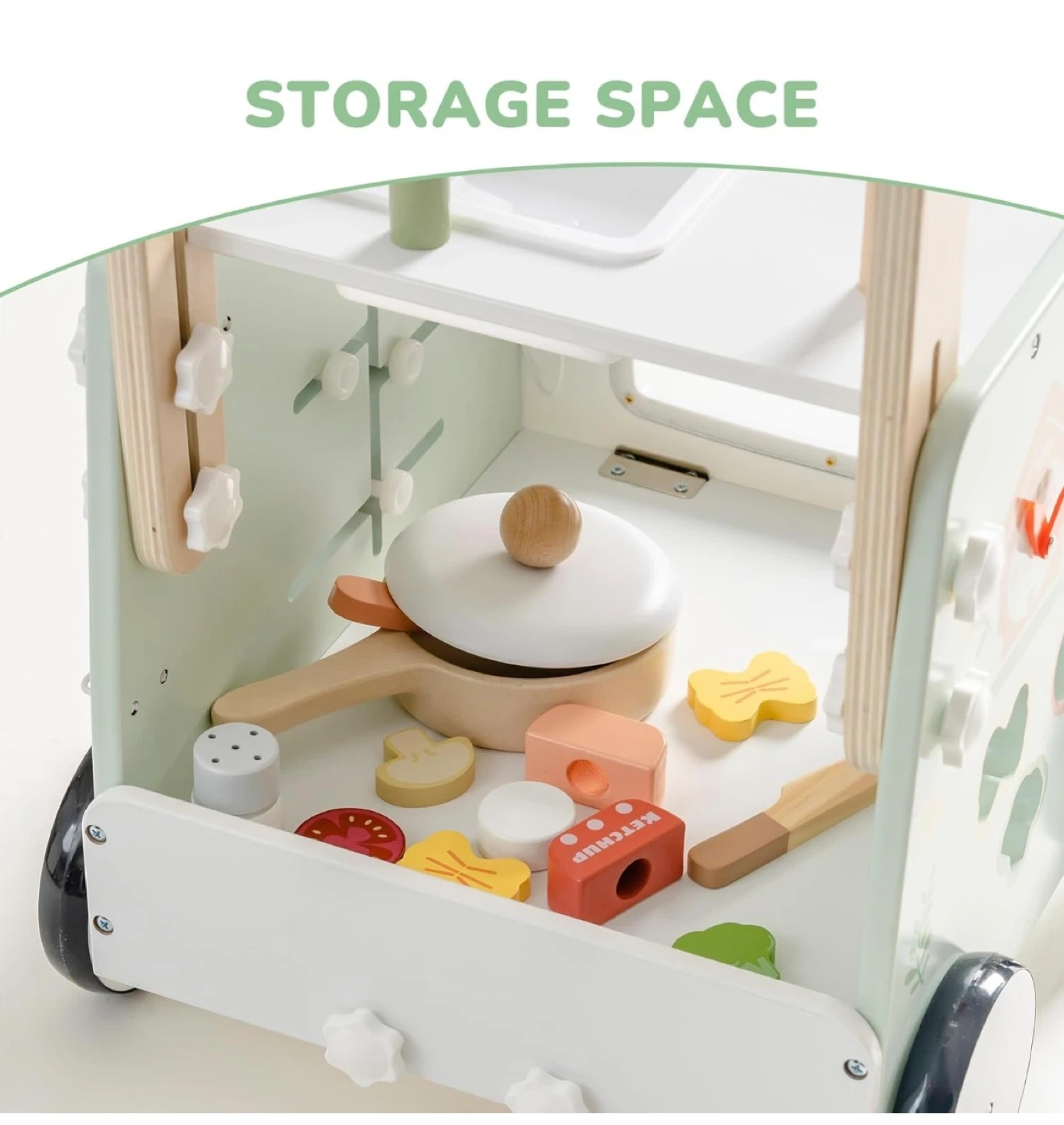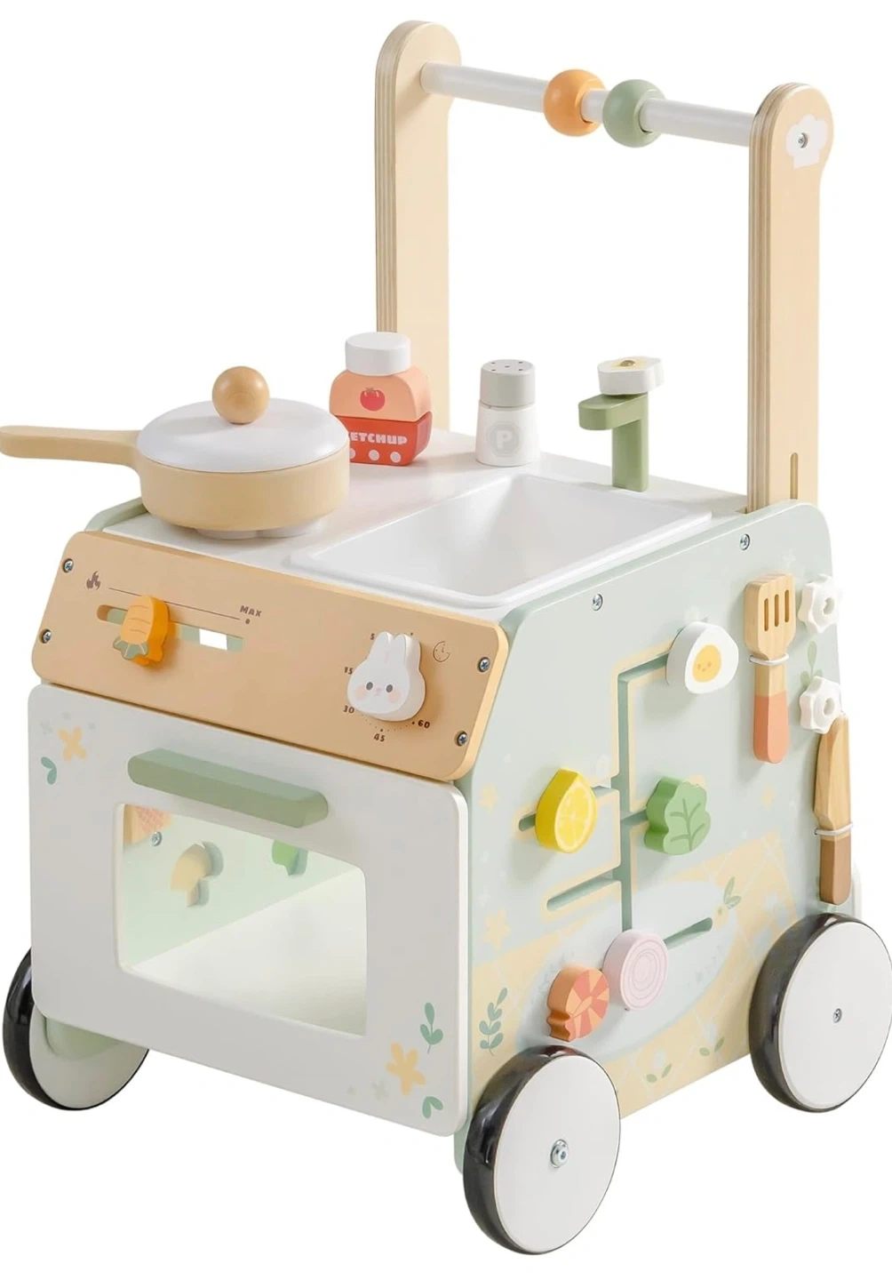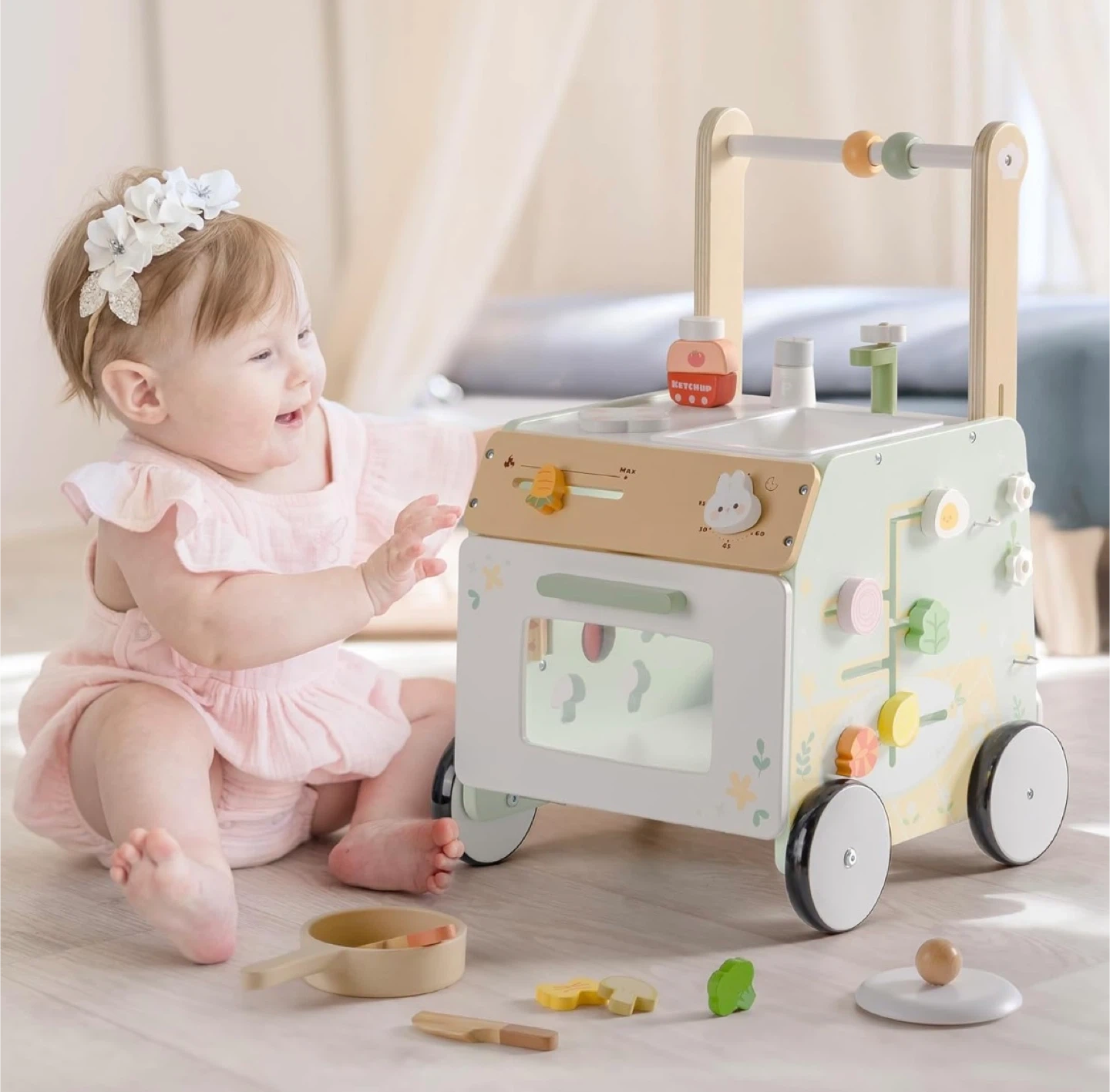 This wooden baby walker activity center offers a variety of engaging activities. It's designed to help prevent O-legs and features speed adjustment for safety. It also includes ample storage space for toys and accessories.