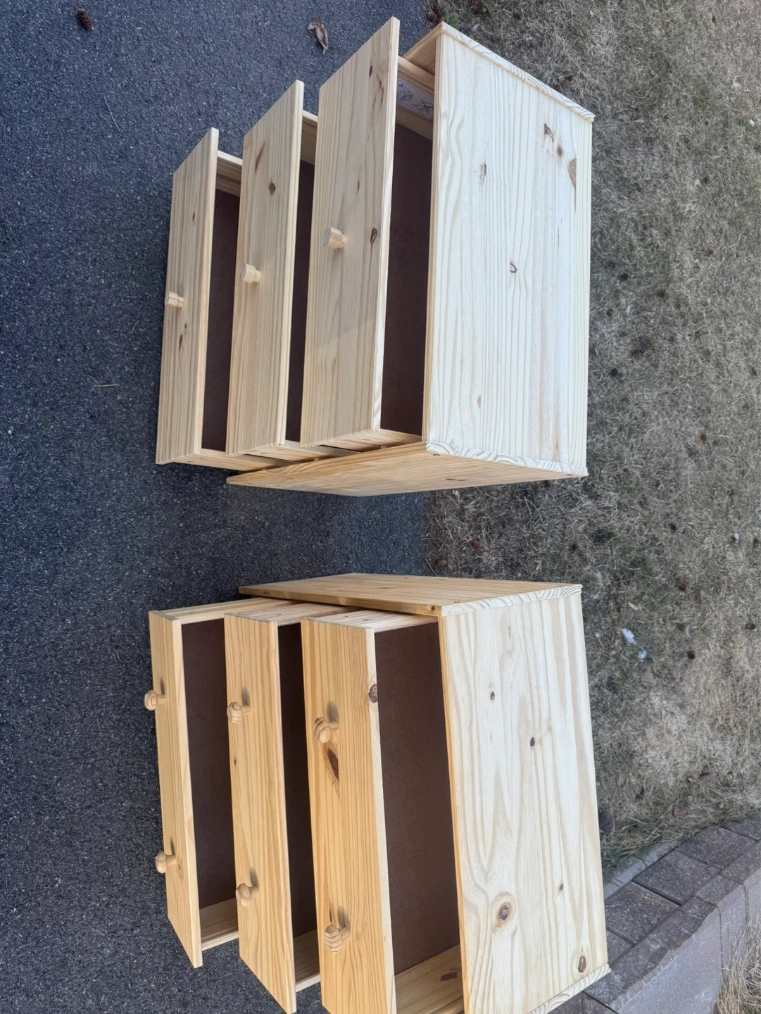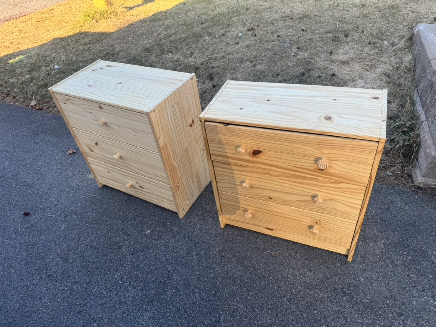 Two unfinished pine wood dressers. Both have three drawers each. Wood construction with simple knob pulls. Great for a kids' room or unfinished storage.home delivery available