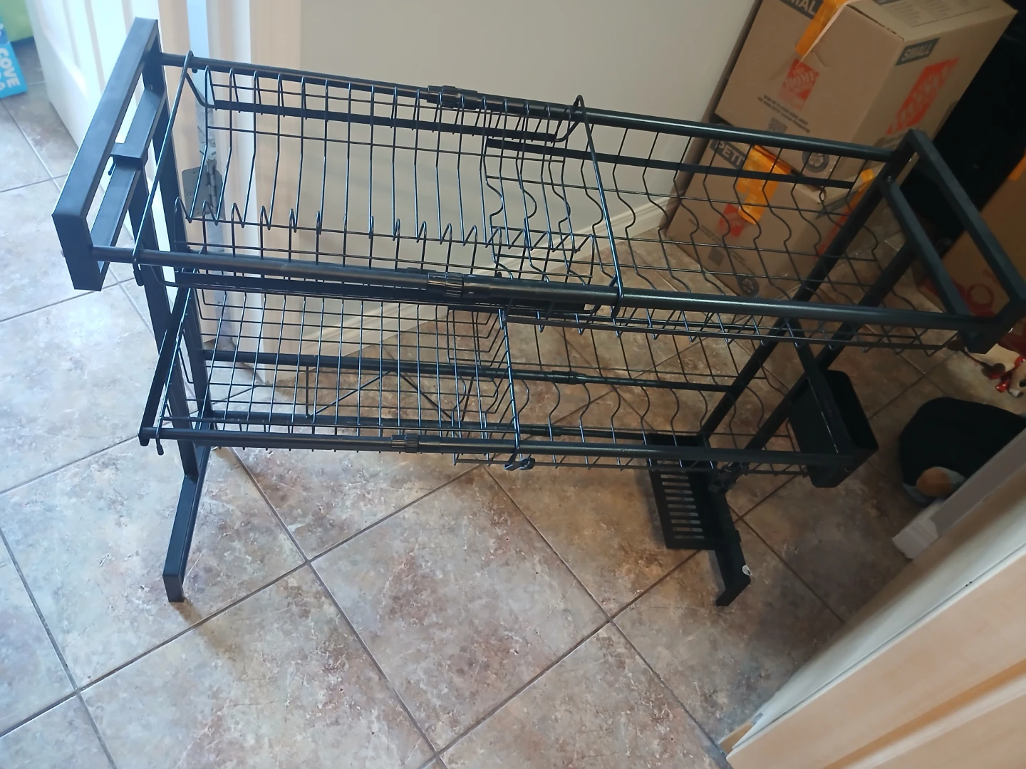 This is a two-tier dish drying rack. It's made of metal and has a black finish. This rack is great for organizing dishes after washing, wide for over double sink.