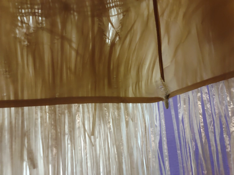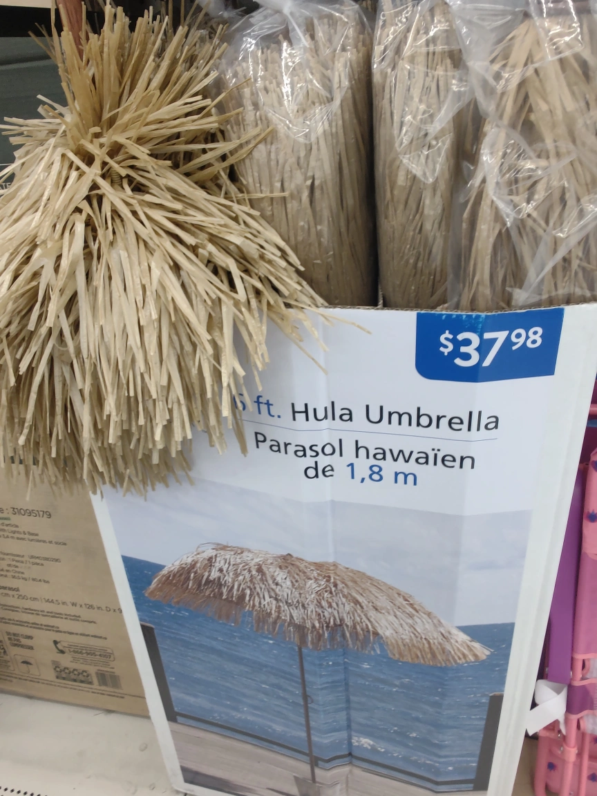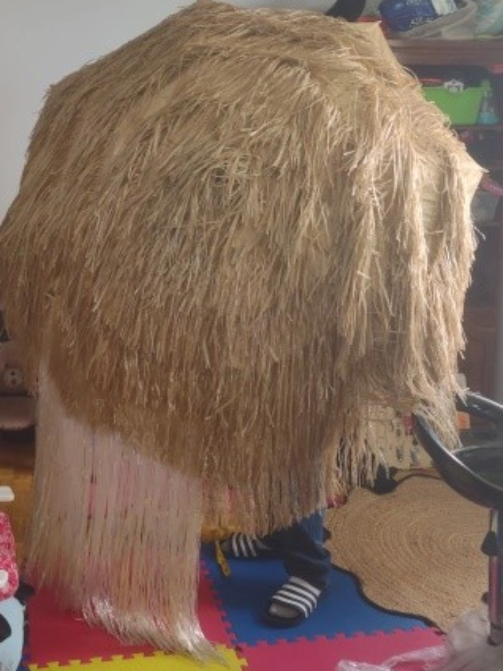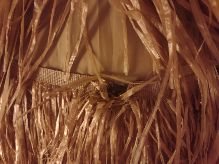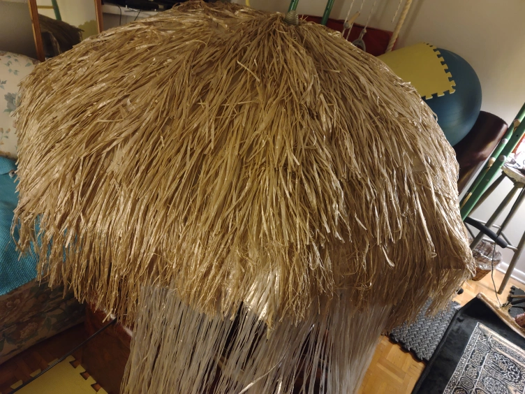 A vintage parasol. Features a round canopy made of long strands of wicker , ( straws ) A good way to feel relaxed, while enjoying some shade on a sunny day.