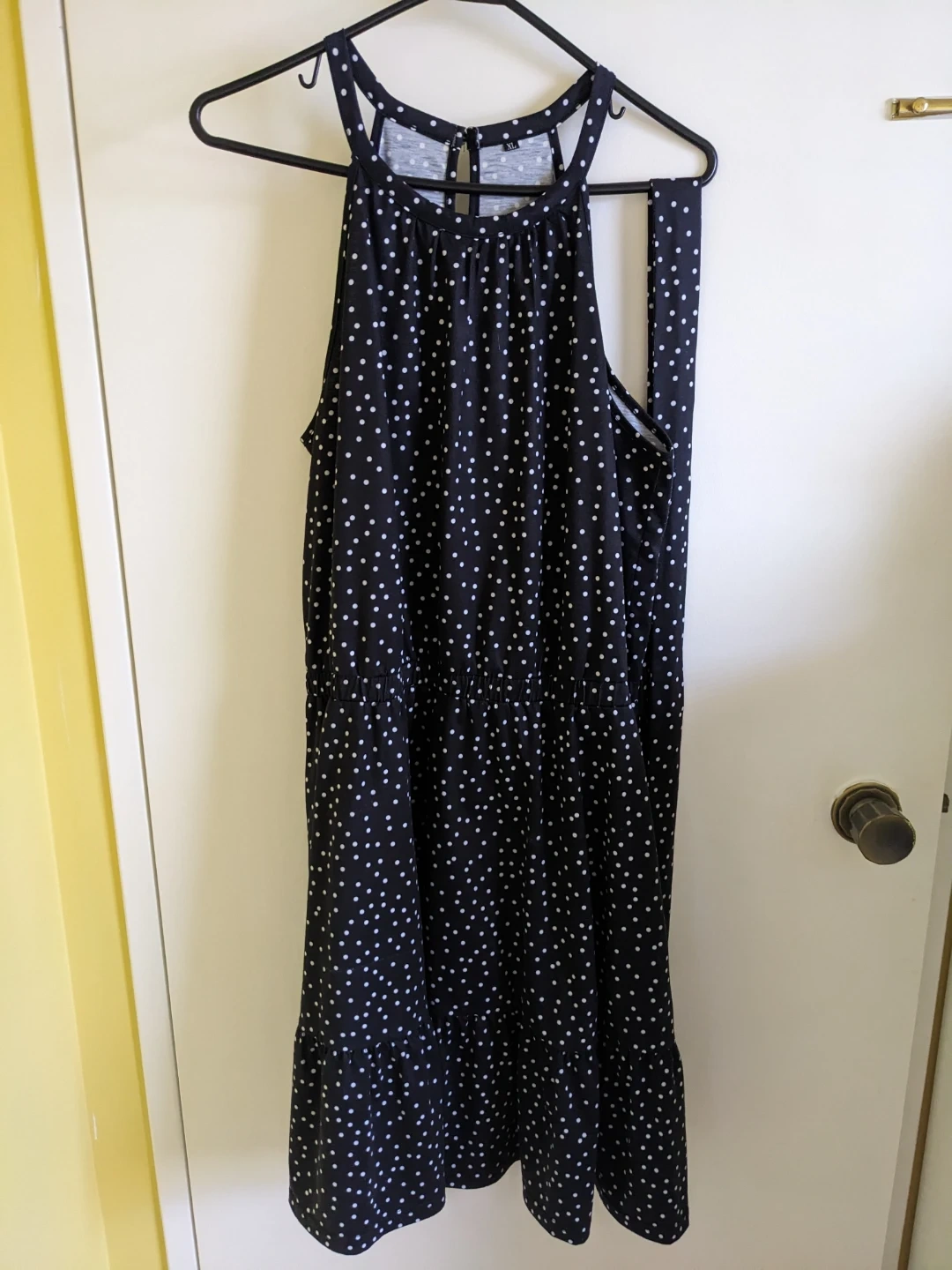 This is a black halter neck dress with white polka dots. It's a size XL. The dress has a gathered neckline and a tie closure at the back. This dress is great for warmer weather!
