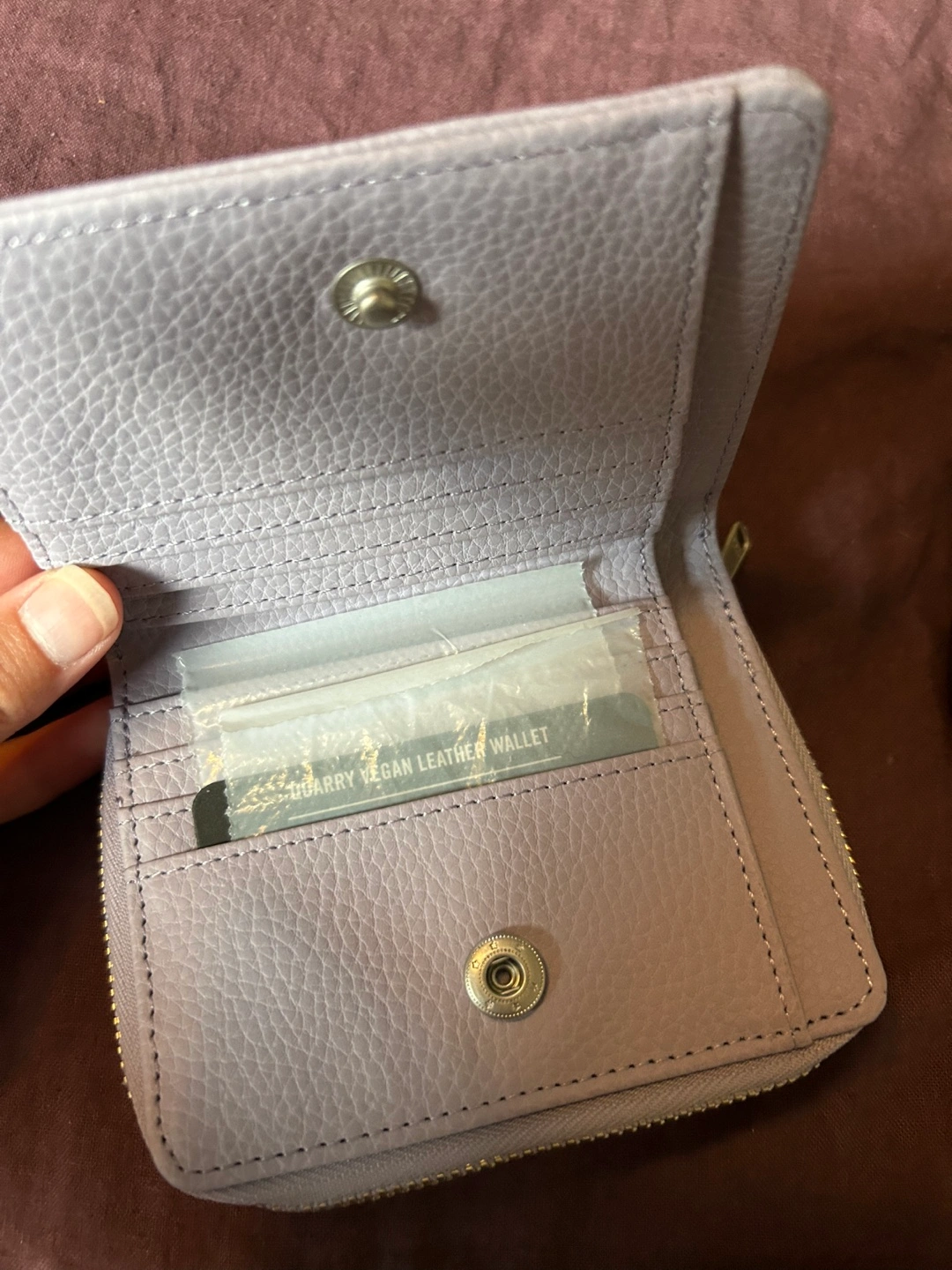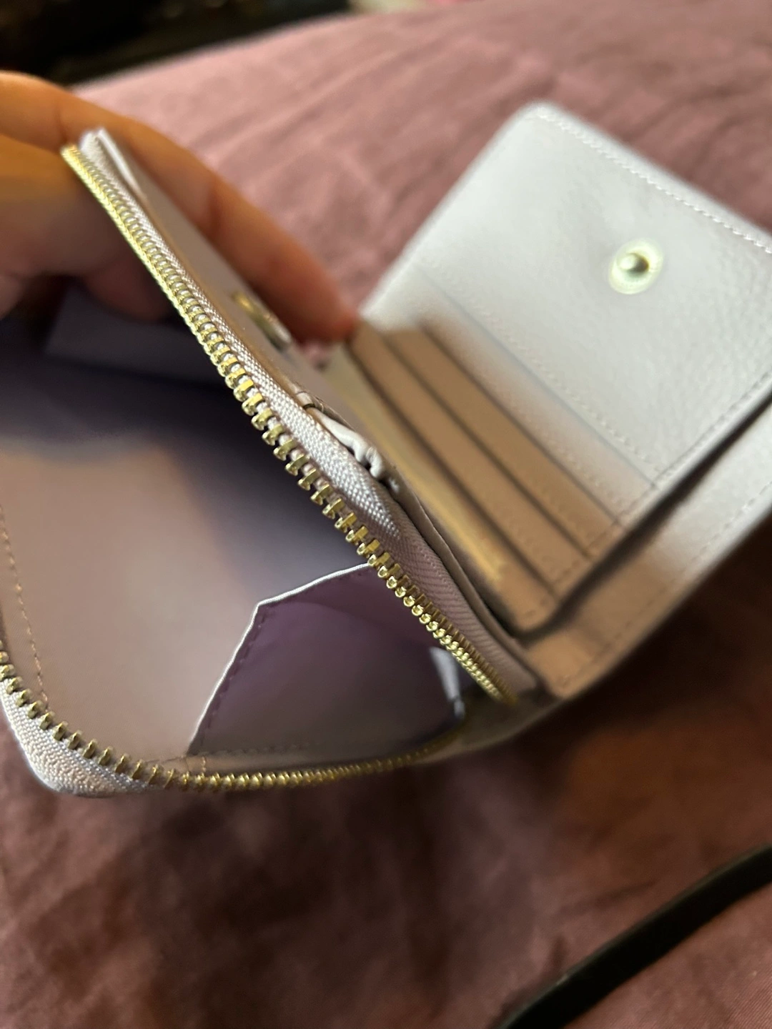 Compact zippered wallet. Features multiple card slots and a zippered closure. Vegan leather. Lilac colour. Never used, tags on.