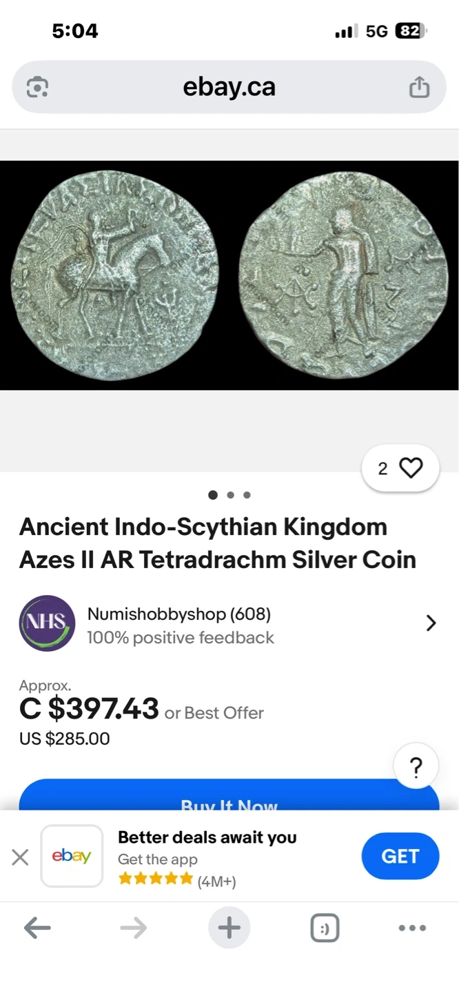 This is an ancient silver coin from the Indo-Scythian Kingdom, attributed to King Azes II. It's a Tetradrachm denomination. The coin features historical imagery and inscriptions.