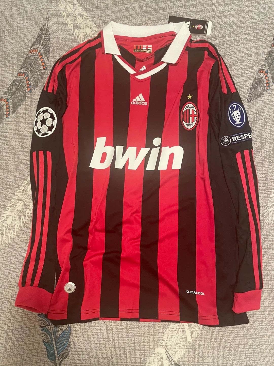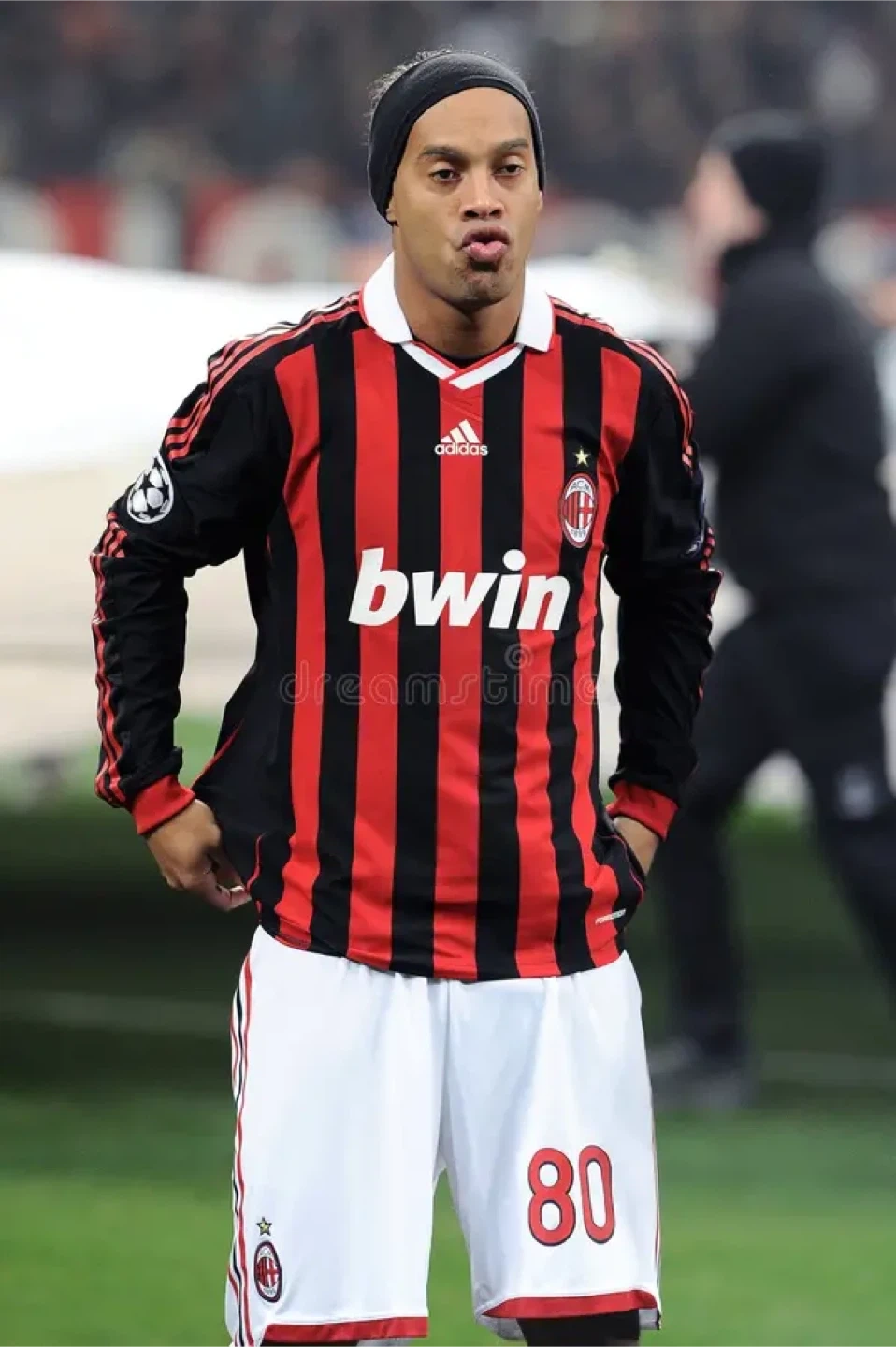 This is an AC Milan long sleeve jersey featuring Ronaldinho's name and number 80. It's a classic red and black striped design with Adidas branding and 'bwin' sponsor. The jersey includes Champions League patches on the sleeves.