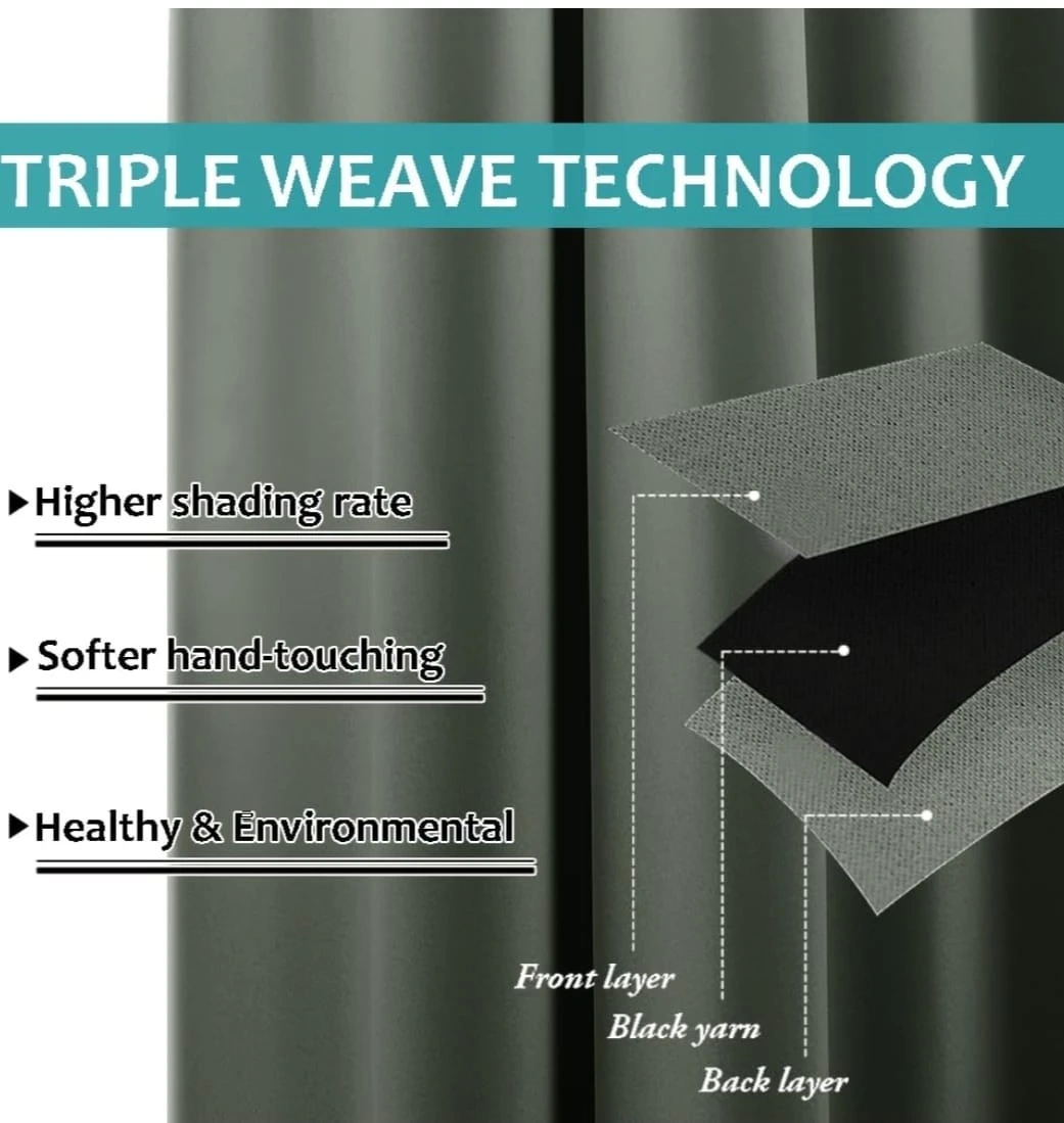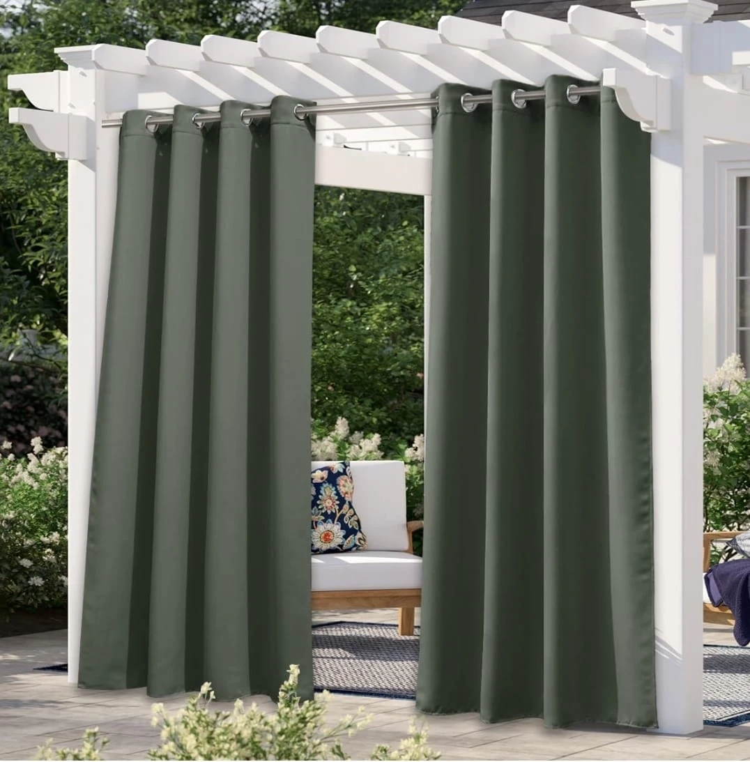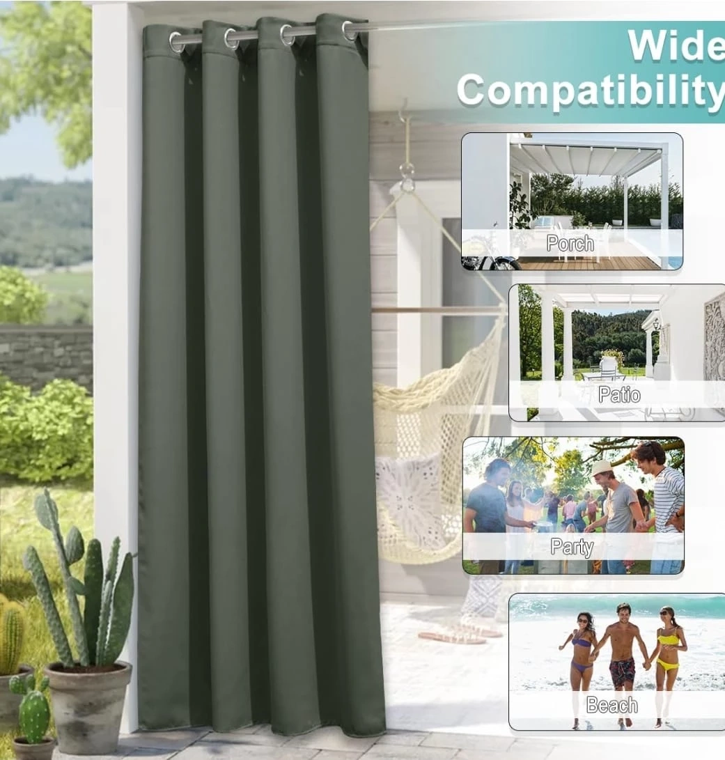 These outdoor curtains feature a triple weave technology for a higher shading rate, offering a softer hand-touching experience and are designed to be healthy and environmentally friendly. They are waterproof and compatible with various outdoor settings, such as porches, patios, parties, and beaches. The curtains come with silver grommets made of high-quality stainless steel, sized at 1.6 inches