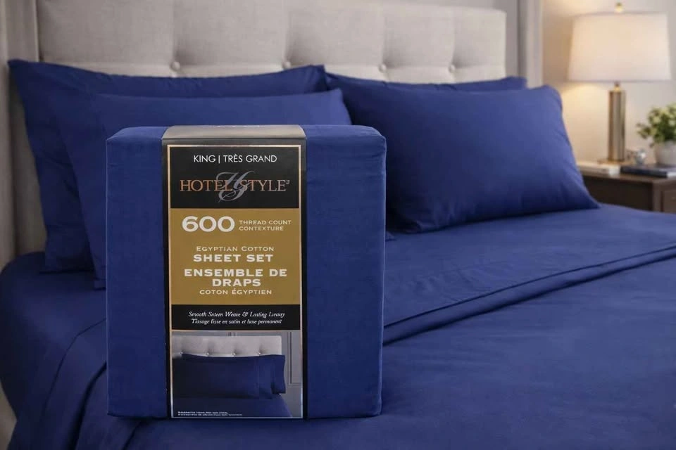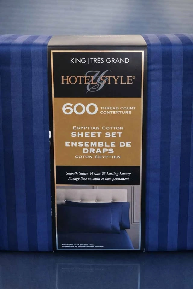 Brand new, unused, and still sealed in the original retail packaging. Outer plastic and cardboard insert show minor shelf wear from retail handling only — sheets inside are untouched. Hotel Style brand, 600 thread count Egyptian cotton sheet set. King size in deep navy blue. Smooth sateen weave is soft, breathable, and crisp. True Grip stretch corners keep the fitted sheet snug. Fits King mattresses 9–18 inches deep. OEKO-TEX Standard 100 certified. Includes full 4-piece set: 1 King flat sheet (110 x 104 in), 1 King fitted sheet (78 x 80 in), 2 King pillowcases (21 x 40 in). This is a clean, new-in-package set — a great hotel-style upgrade without paying store prices. If the ad is up, it's available. Pickup near Uptown Mall, Victoria. Cash or e-transfer. Pickup, meet, or delivery available. Price: $60 firm.