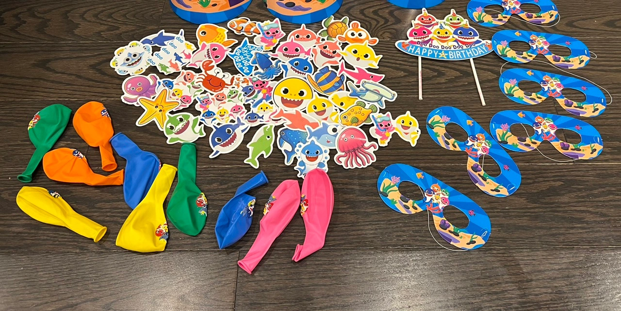 8 shark aluminum foil balloons, 6 shark round aluminum foil balloons, 1 set of shark birthday letters, 1 set of shark birthday cakes topper, 6 shark paper hats, 6 shark paper masks, 10 shark balloons, 40 shark stickers, 1 set of number 1 in letters.