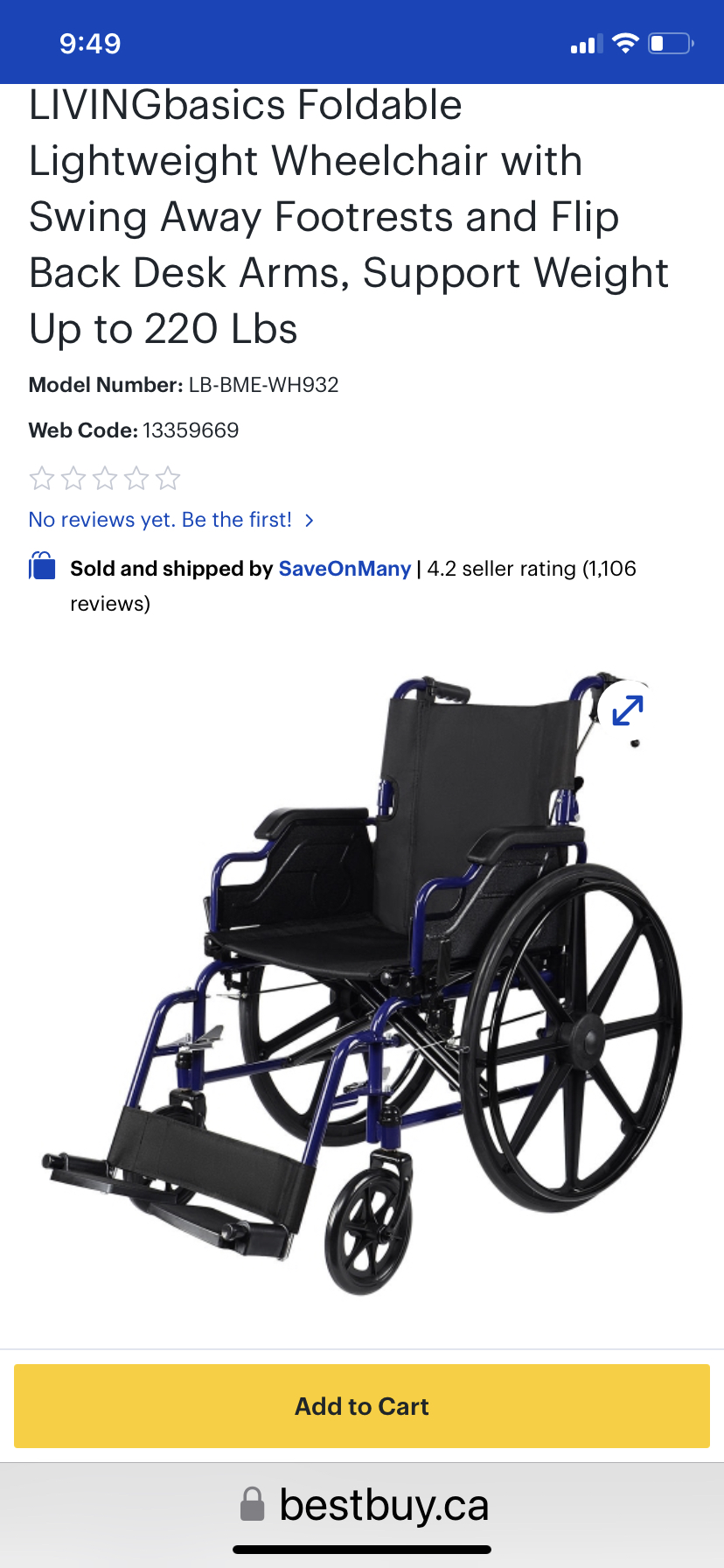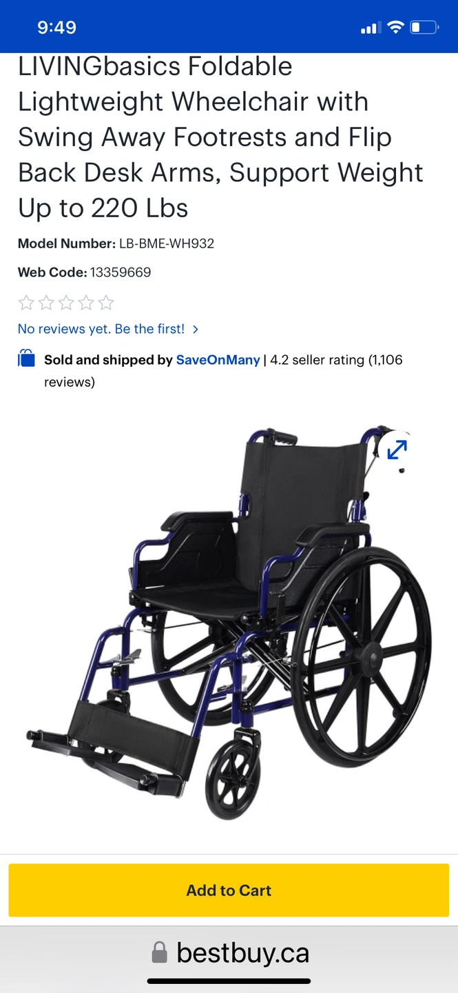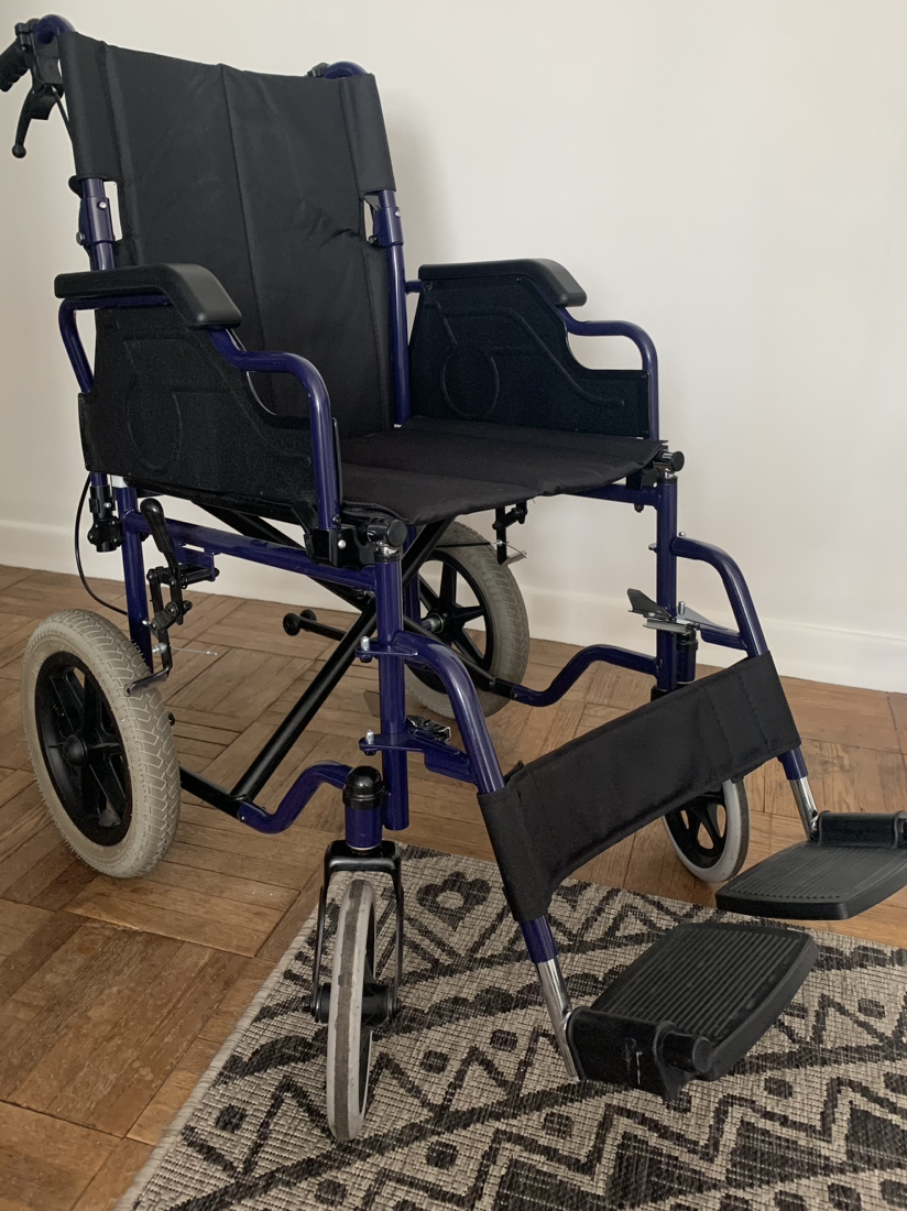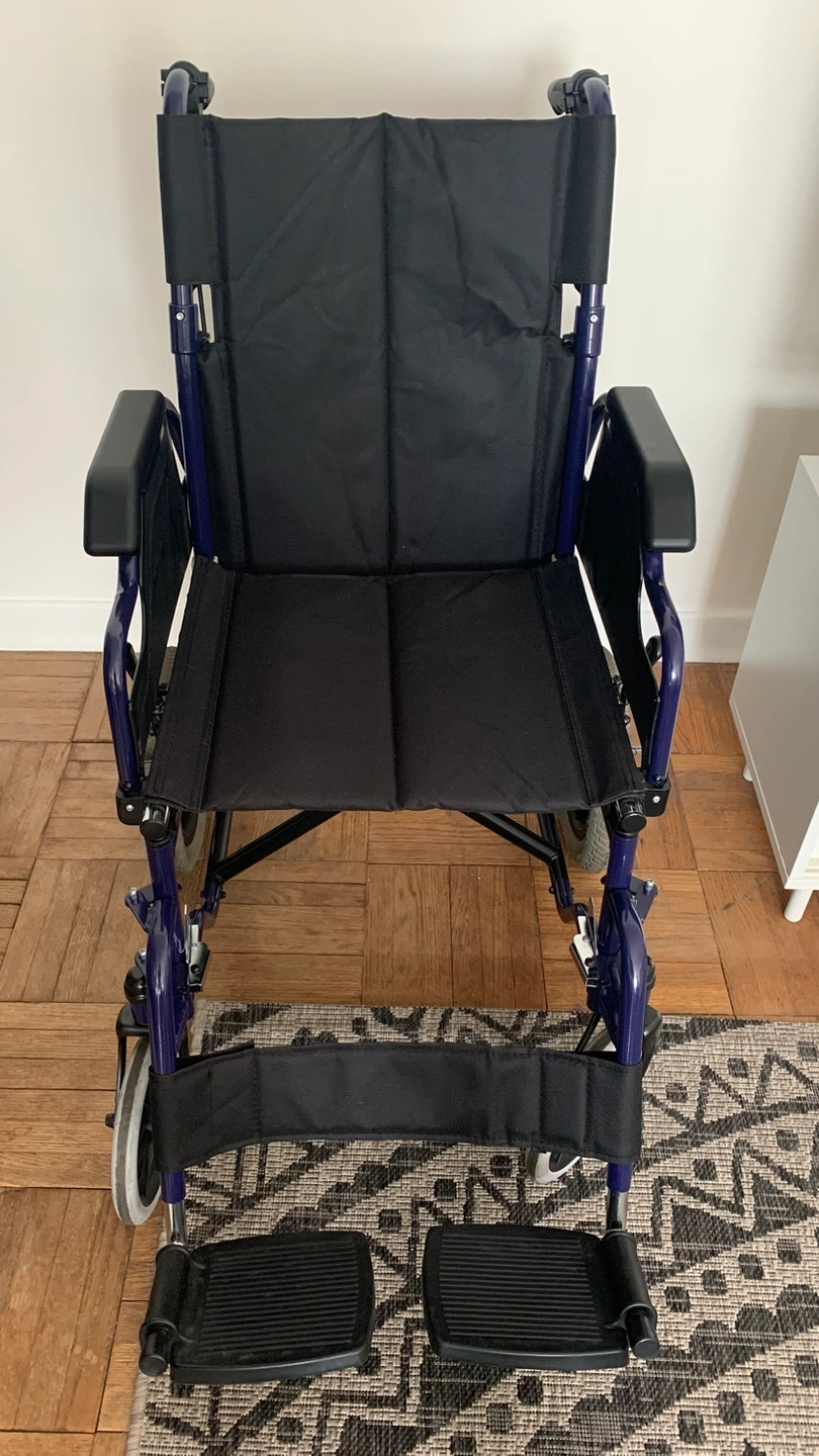 In good condition. Lightweight foldable wheelchair. See picture #5 for details. Has anti-tip wheels installed in the back for safety. Paid $220 for it.