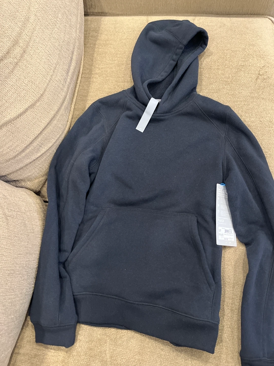 FWD Boy's All Year pullover hoodie in black. Made with recycled polyester and features a hidden media pocket. It's super soft brushed fleece interior. Size is large.