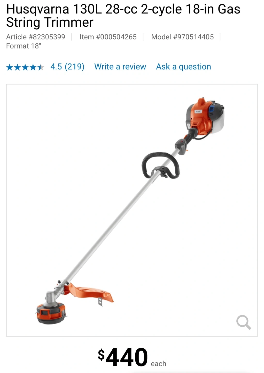 Buy & SellHusqvarna 130L Gas String Trimmer - 18"Husqvarna 130L Gas String Trimmer - 18"$301Husqvarna 130L gas string trimmer. It's an 18-inch cutting width model. Includes the original box.ConditionNewWHERE TO MEETCheck LocationView MapSELLERverifiedRahPinecrest600 reviews0 chats·0 favorites·11 viewsSEND CHAT TO SELLERHi Rah! I’m interested in your listing.Hi Rah! I’m interested in your listing.Get the Karrot app to chatSign In to chat