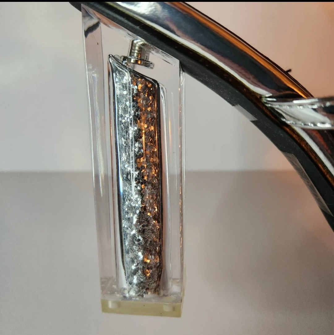 Brand new Sexy/Sparkly Silver shoes with silver glitter and lucite heels.