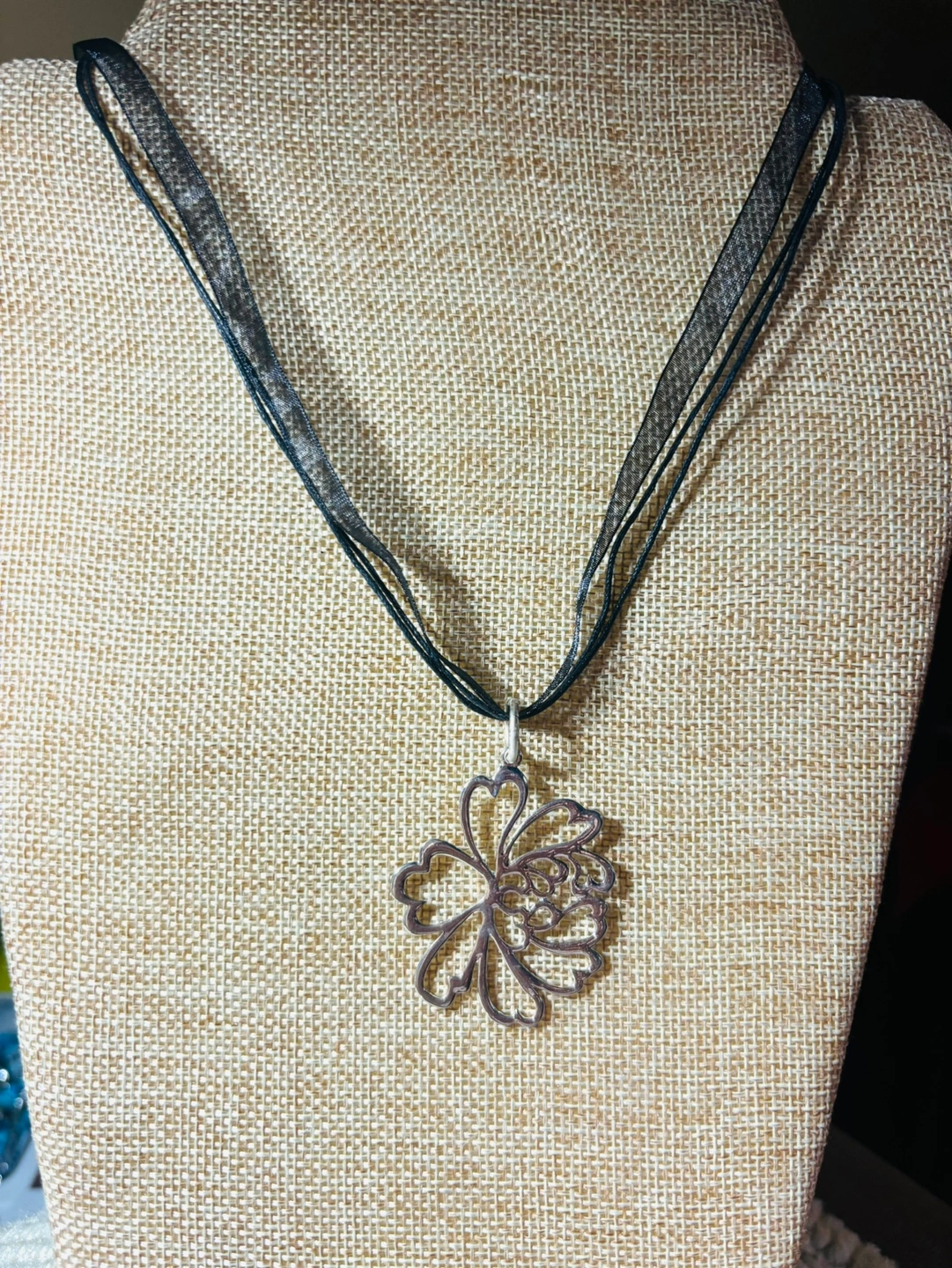 This necklace features a silver flower pendant on a black ribbon. The pendant is a cutout design of a flower with a delicate filigree pattern. The ribbon is a triple strand, creating a layered look. The necklace is perfect for adding a touch of elegance to any outfit.