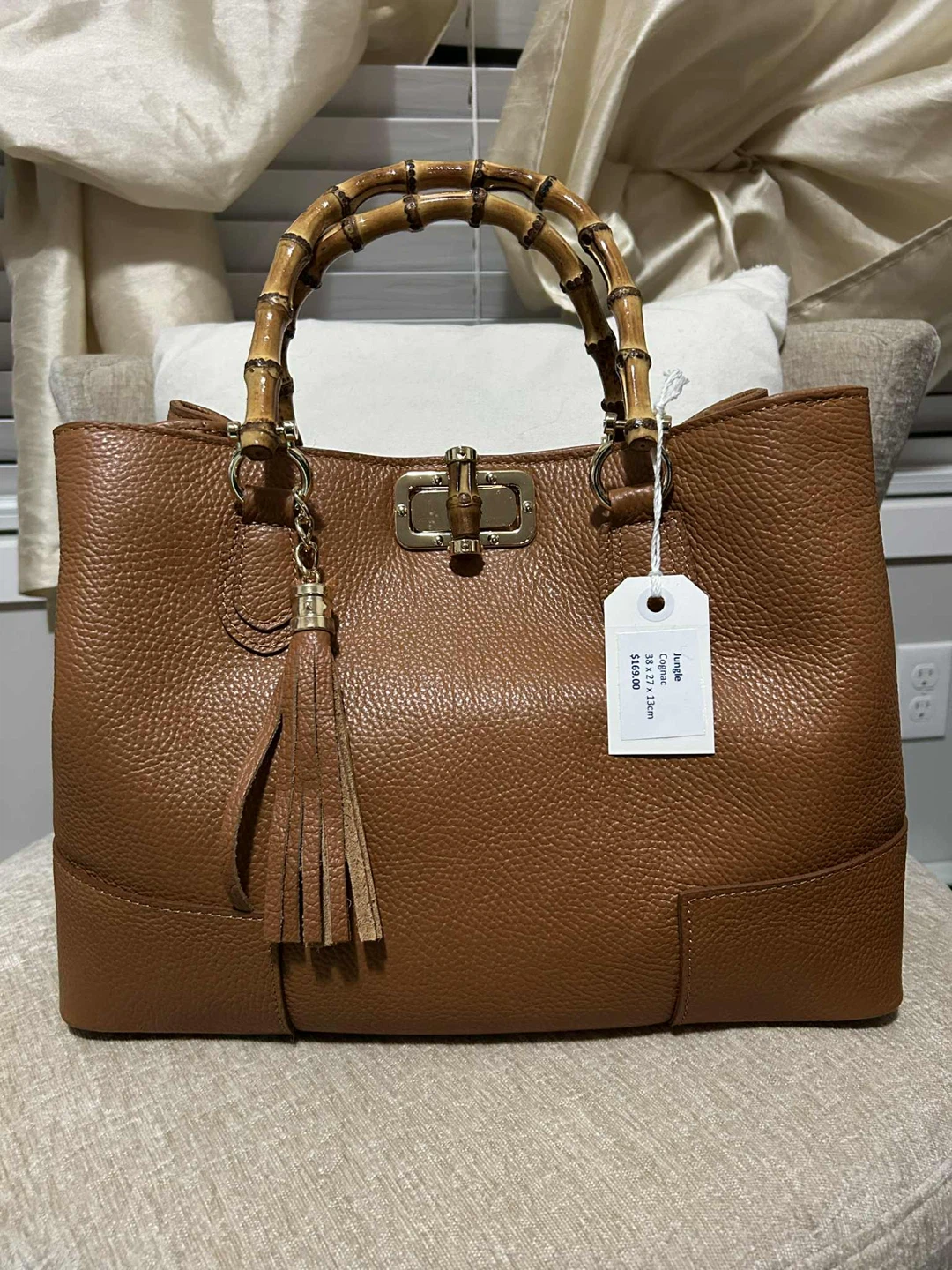 1 / 11 / 1Buy & SellJungle Cognac Leather Tote BagJungle Cognac Leather Tote Bag$85This is a lovely cognac leather tote bag. It measures 38 x 27 x 13 cm. It has a stylish bamboo handle and a fun tassel detailConditionNewWHERE TO MEETCheck LocationView MapSELLERverifiedKenRutherford1094 reviews0 chats·2 favorites·50 viewsSEND CHAT TO SELLERHi Ken! I’m interested in your listing.Hi Ken! I’m interested in your listing.Get the Karrot app to chatSign In to chat