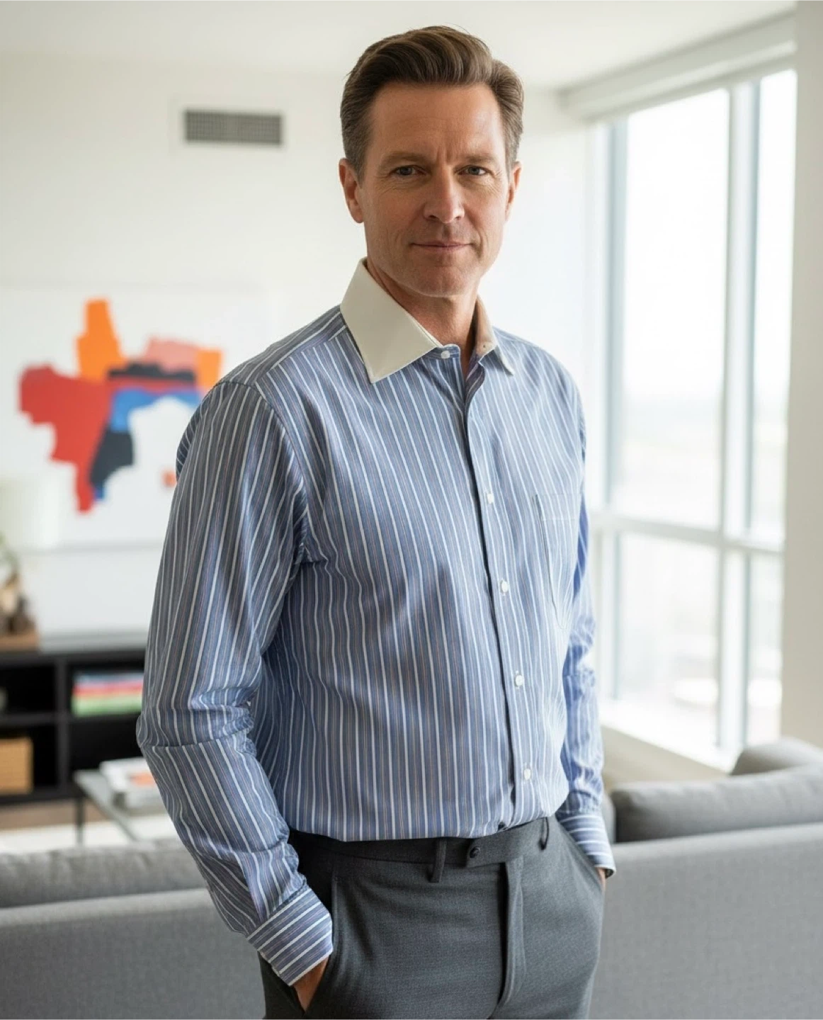 A classic long-sleeved dress shirt from Burberry London. It's a blue pinstripe with white and red accents. Features a contrasting white collar and a chest pocket.