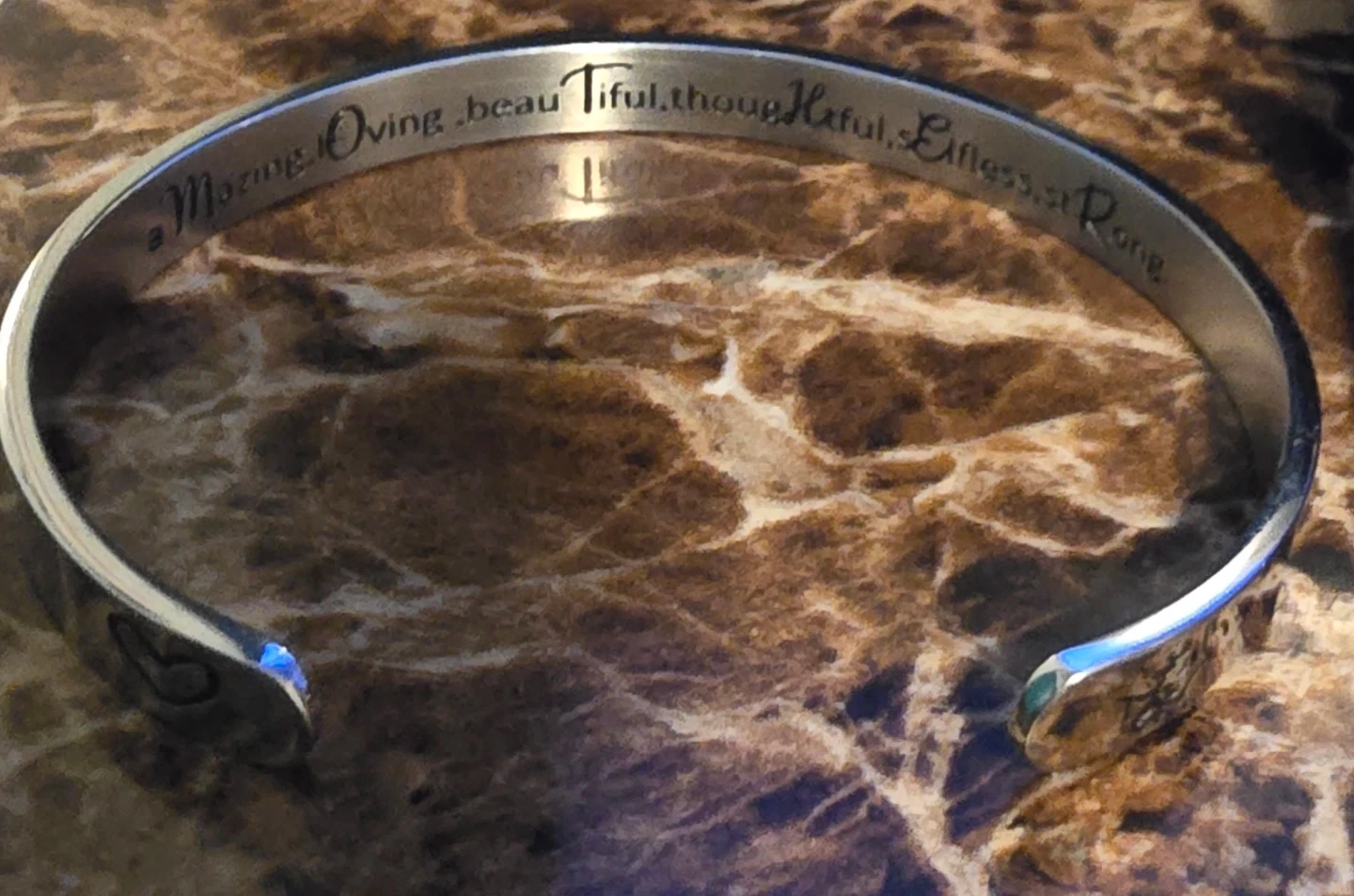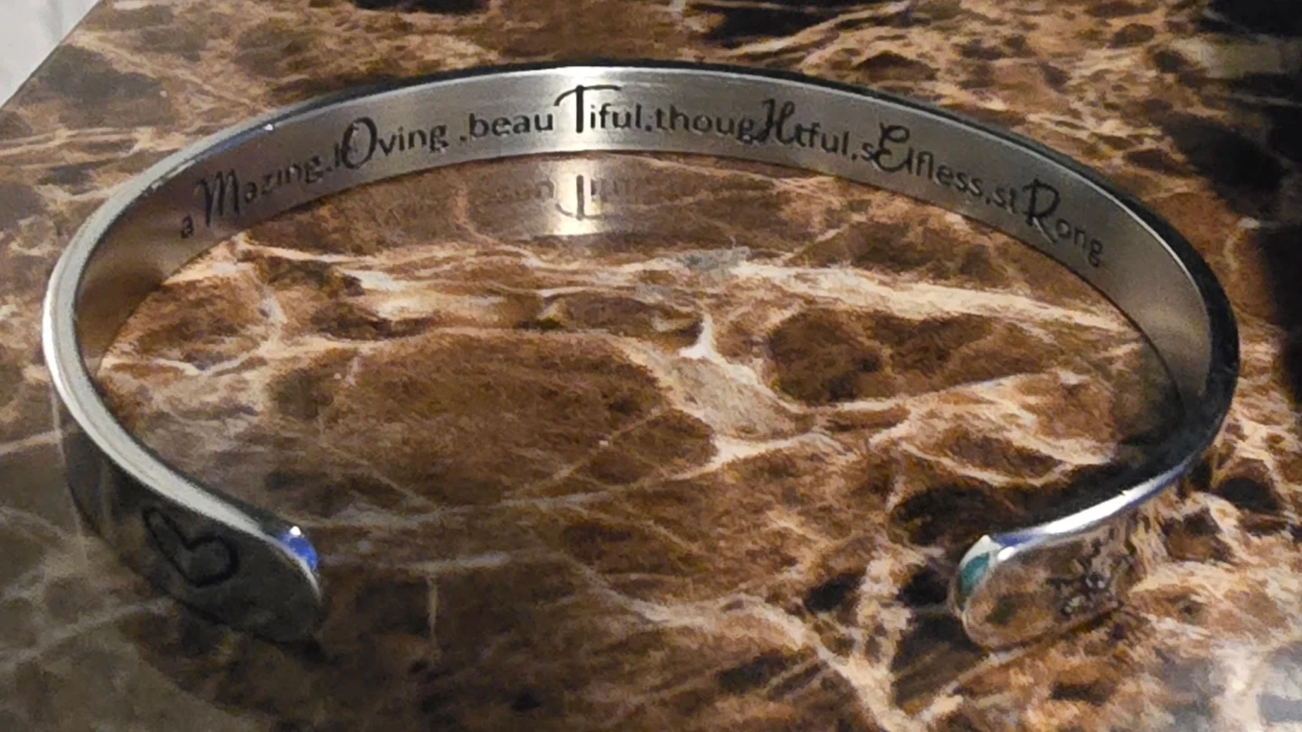 This silver-tone cuff bracelet has an engraved quote: 'aMazing. LOving. beauTiful, thougHtful, sElfless. stRong'. It's made of metal. Perfect for anyone who appreciates unique jewelry!